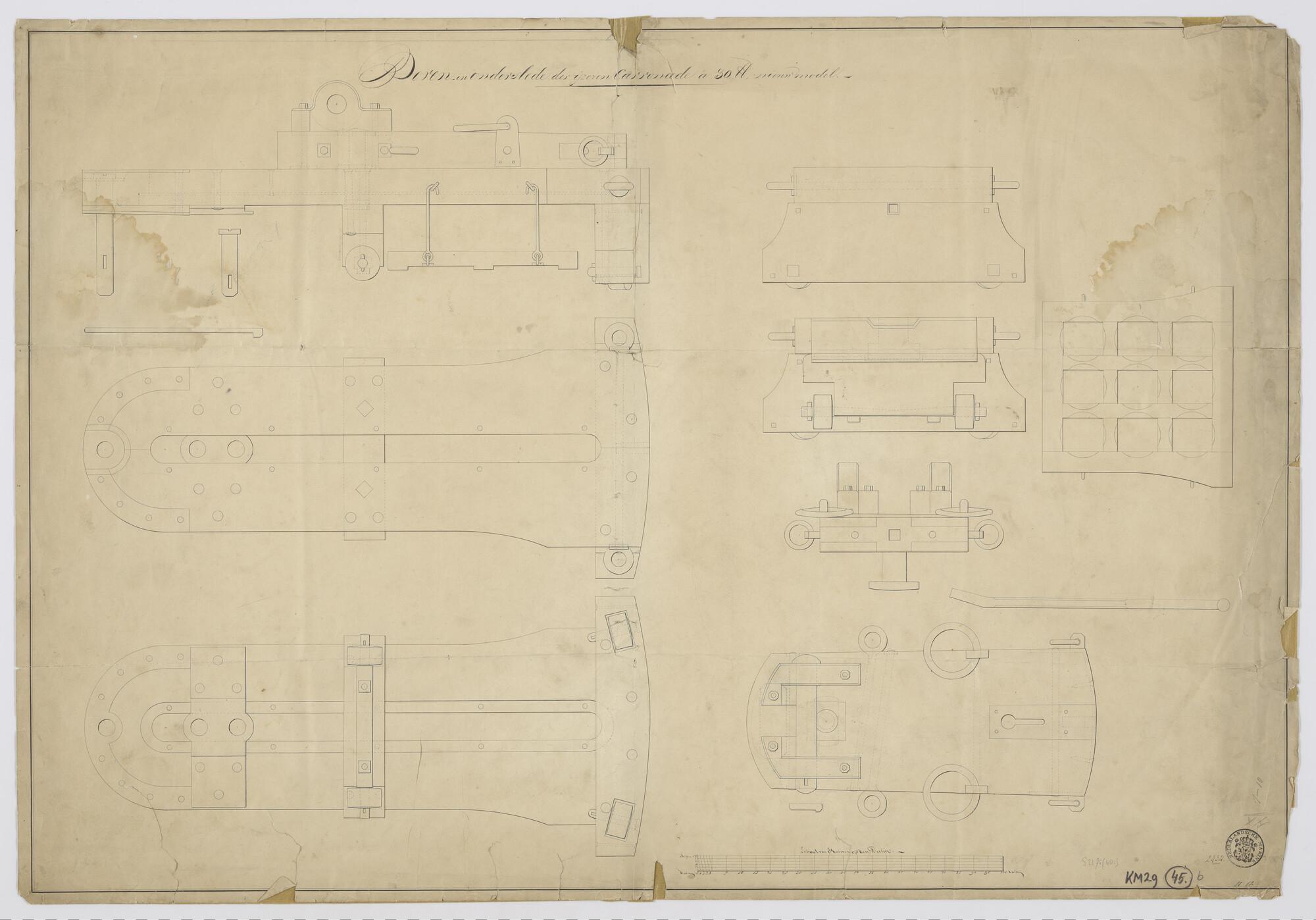 Doorsneden van de boven- en onderslede der ijzeren carronade van 30 lb