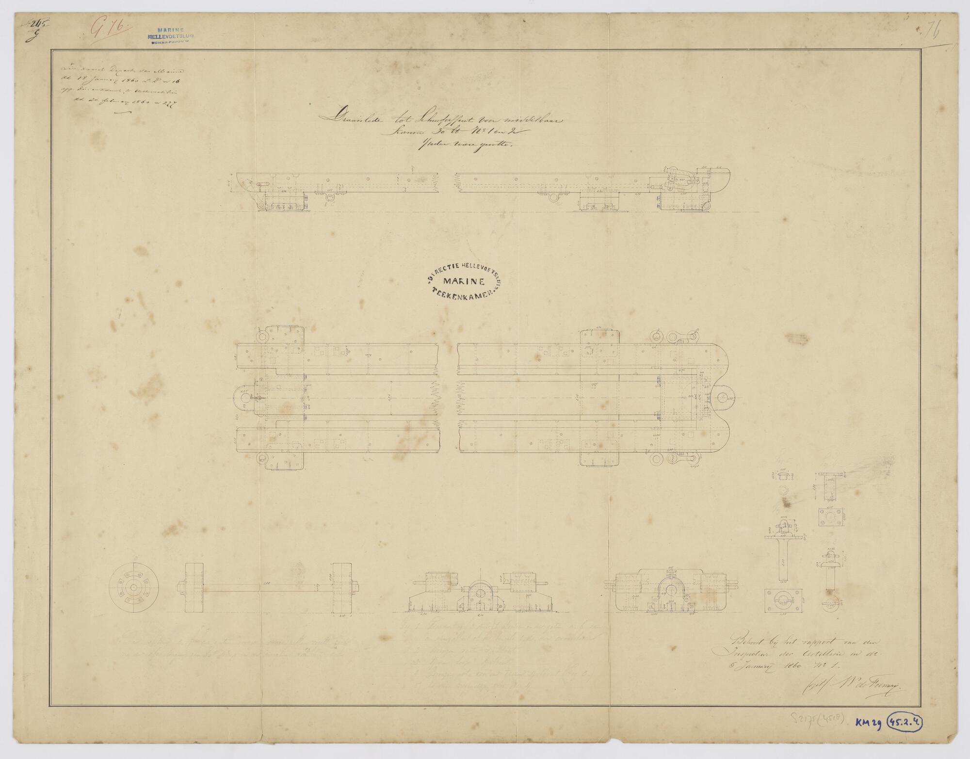 Verticale en horizontale langsdoorsnede en dwarsdoorsneden van de draaislede tot schuifaffuit voor middelbaar kanon 30 lb no 1 en 2 (schaal 1:10).