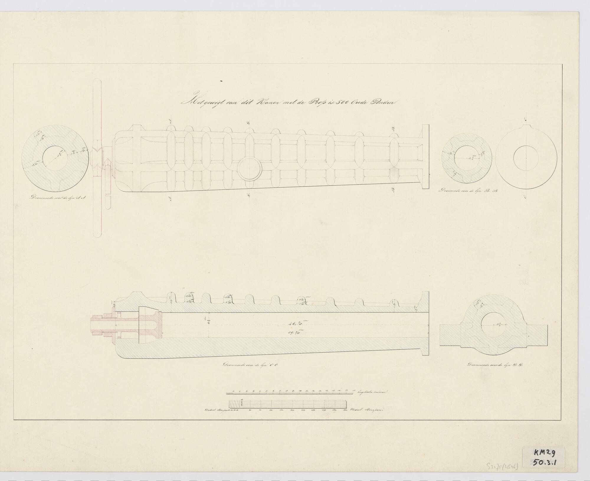 Verticale langsdoorsnede en dwarsdoorsneden van een kanon met de prop (het sluitstuk) met als gewicht 500 oude ponden (schaal in engelse duimen en nederlandse strepen).