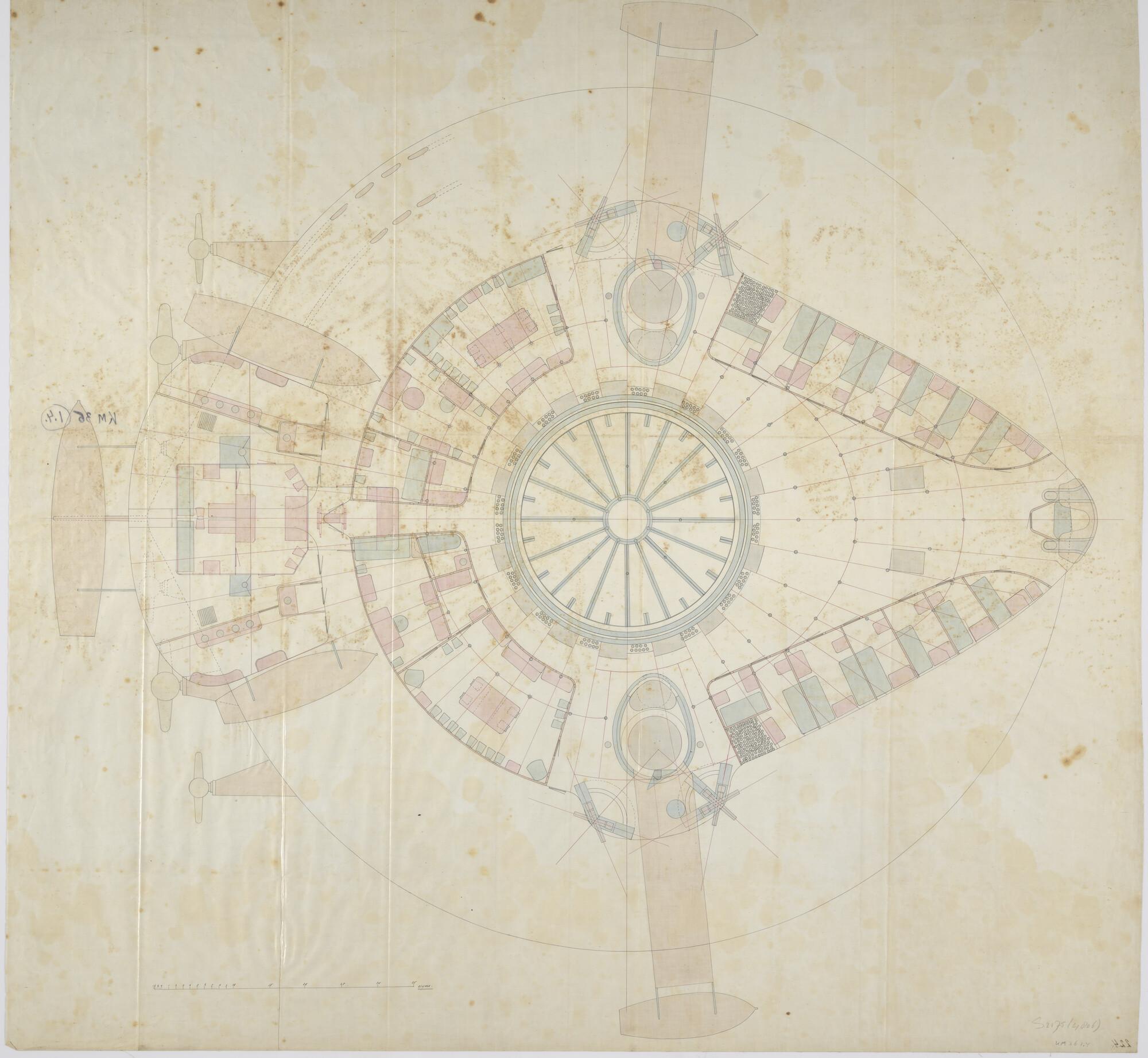 Horizontale dwarsdoorsnede van het bovendek van een schip uit de klasse van het gepantserde kustverdedigingsschip van de Russische keizerlijke marine 'Vice-admiraal Popow'