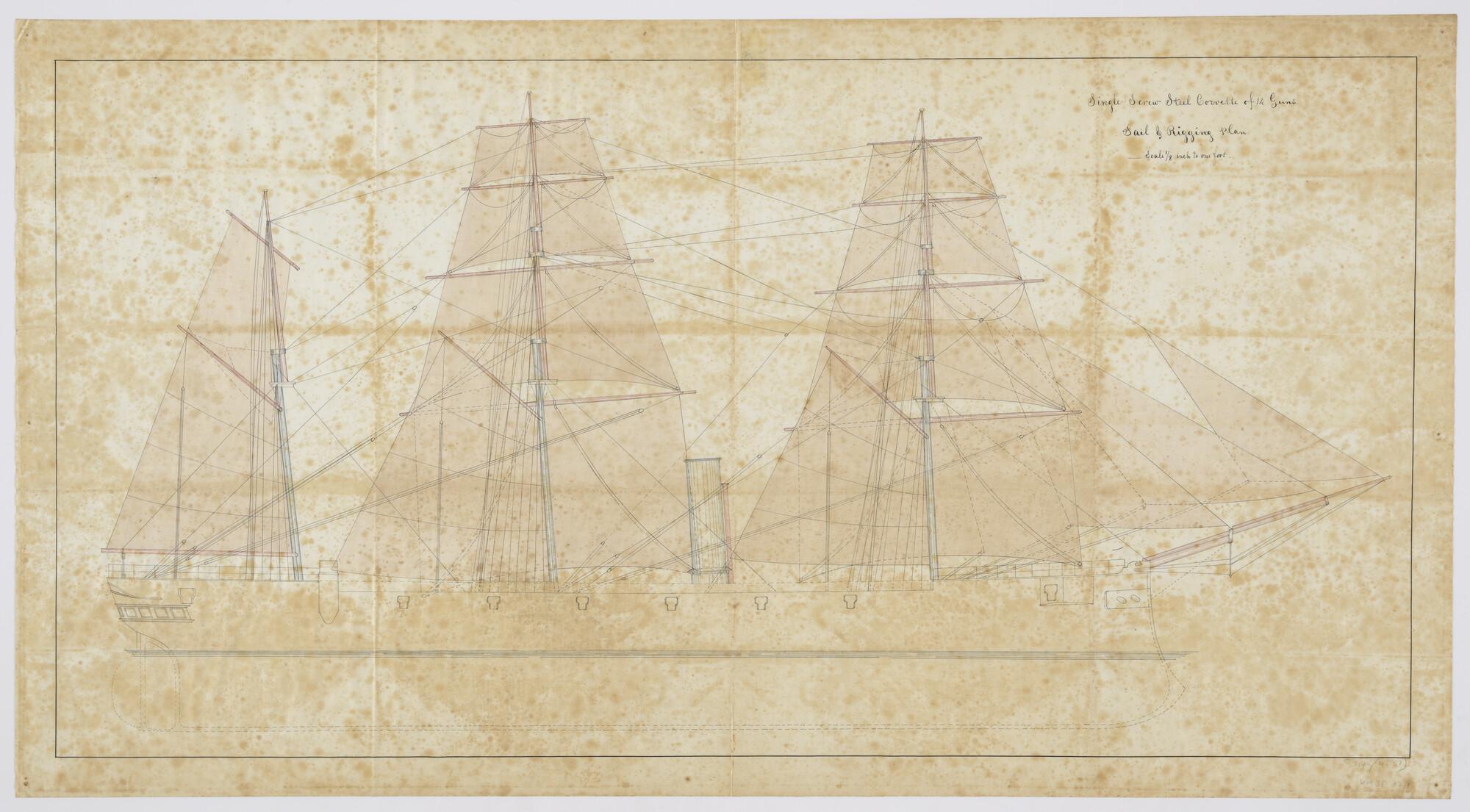 Zijaanzicht over SB-zijde van een stalen korvet uit de 'Calypso' klasse van de Royal Navy. Drie masten; tuigage; schoorsteen; ramsteven; waterlijn (schaal 1/8 inch = 1 foot).