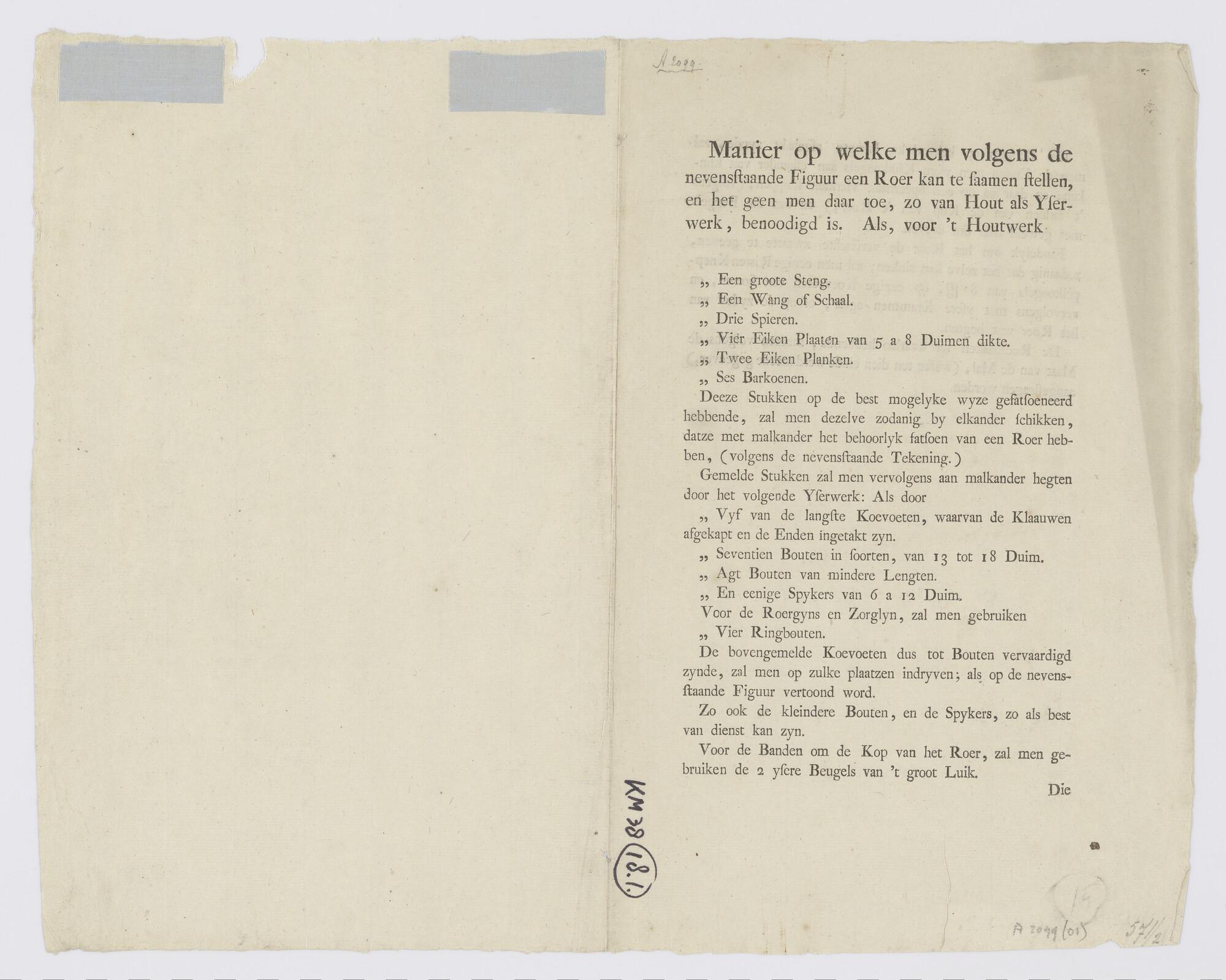 Toelichtende tekst omtrent de samenstelling van een roer met opgave van benodigde onderdelen en materialen (schaal 1:1).
