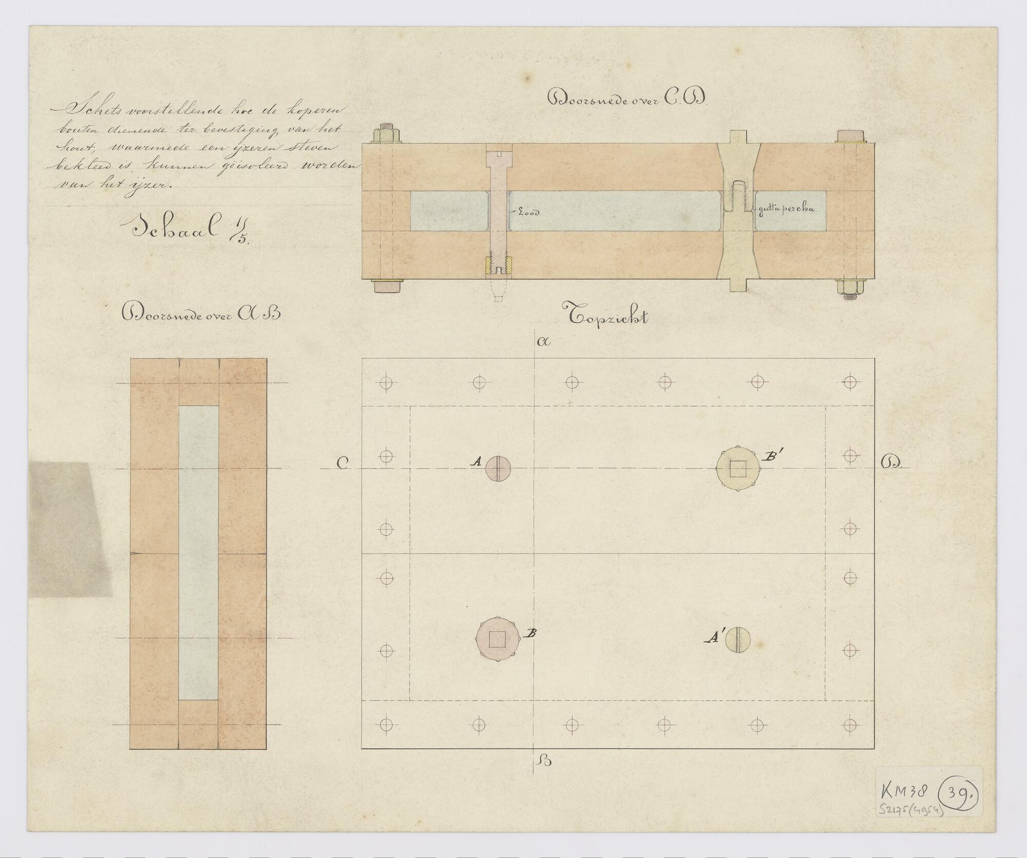 Doorsneden en topzicht van een bevestiging van hout met een ijzeren steven door middel van geïsoleerde koperen bouten (schaal 1:5).