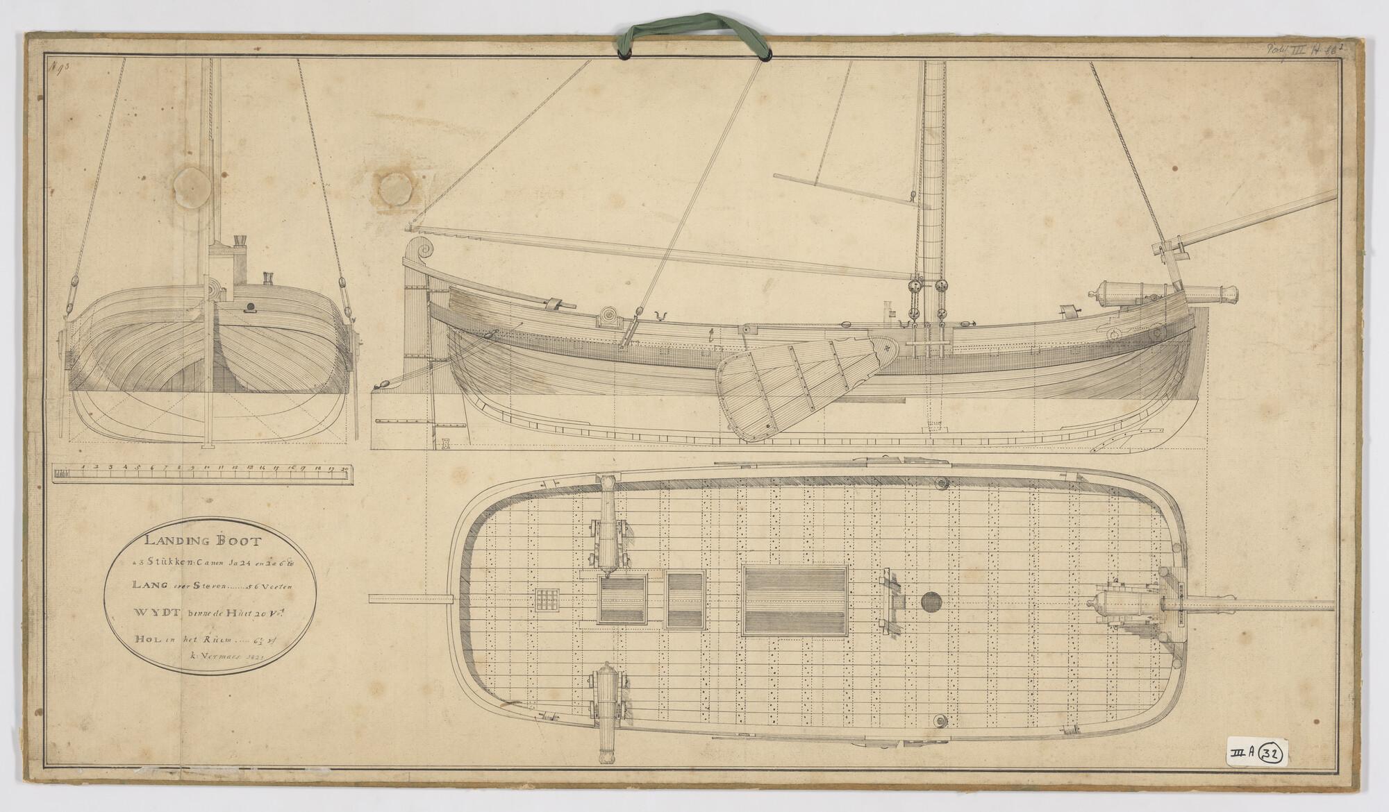 Zijaanzicht, bovenaanzicht, voor- en achteraanzicht, spantenraam en bewapening van een landingsboot, 1821. Afmetingen van het schip 56 x 20 x 6½ voeten.