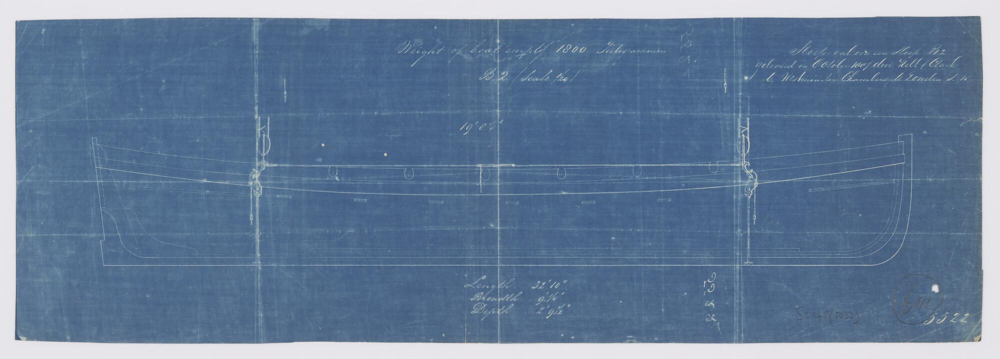 Langsdoorsnede van een sloep B2 met hijsinrichting van Hill & Clark (1887).