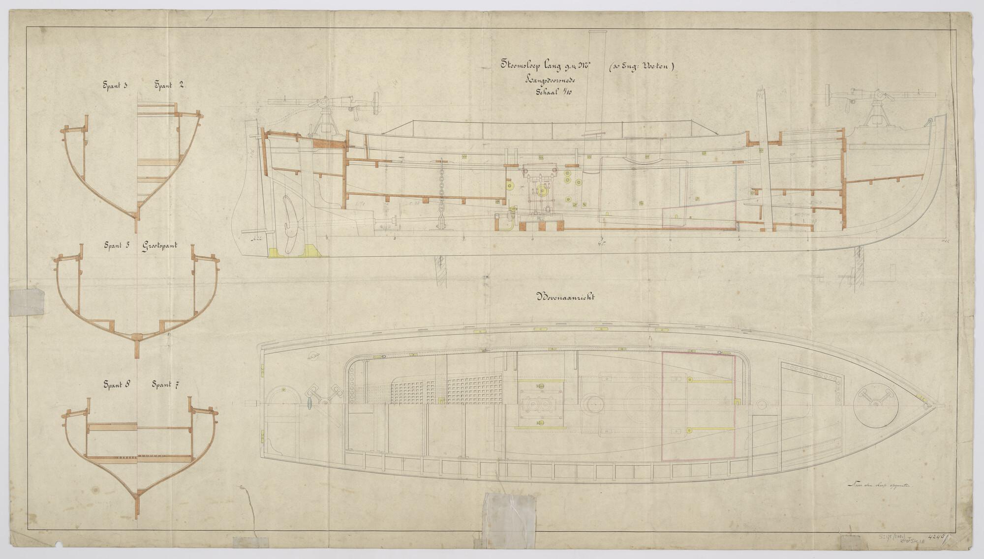 Bovenaanzicht, langsdoorsnede en dwarsdoorsneden over diverse spanten van een stoomsloep lang 9.14 meter (30-voet) naar Engels ontwerp. Neerklapbare schoorsteen, mast, stoomketel, stoommachine, kajuit, bergplaats, bewapening voorop en achteruit (schaal 1:10).