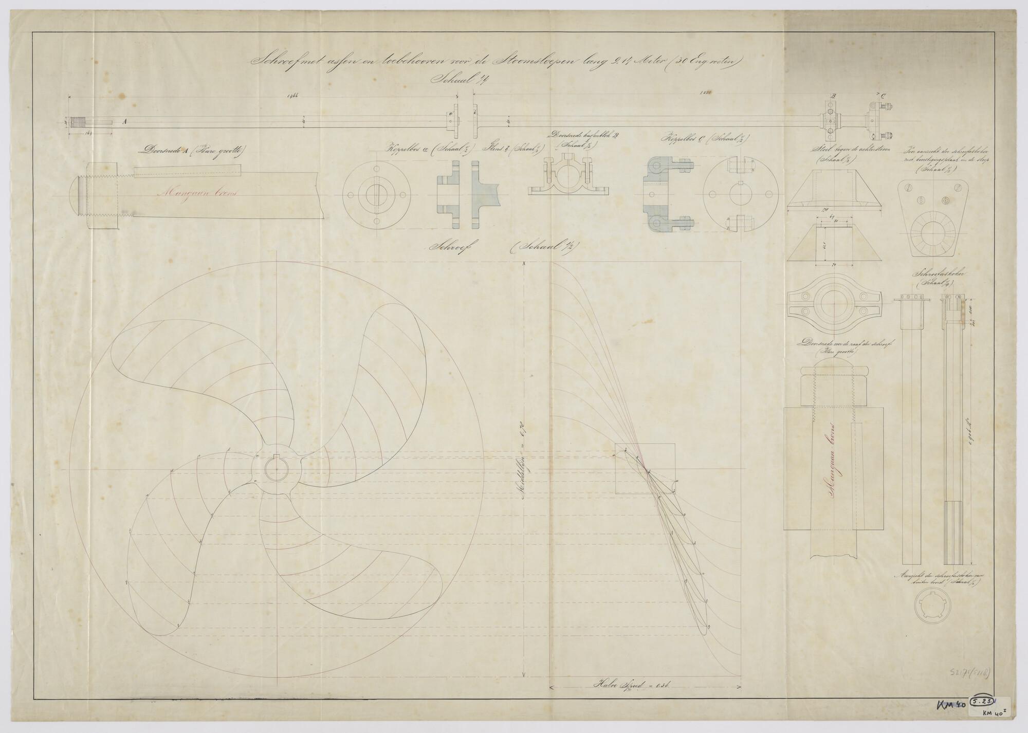 Schroef met assen van de stoomsloep met zeiltuig (S.S.1) lang 9.14 meter (30-voet), naar Engels ontwerp (1879)