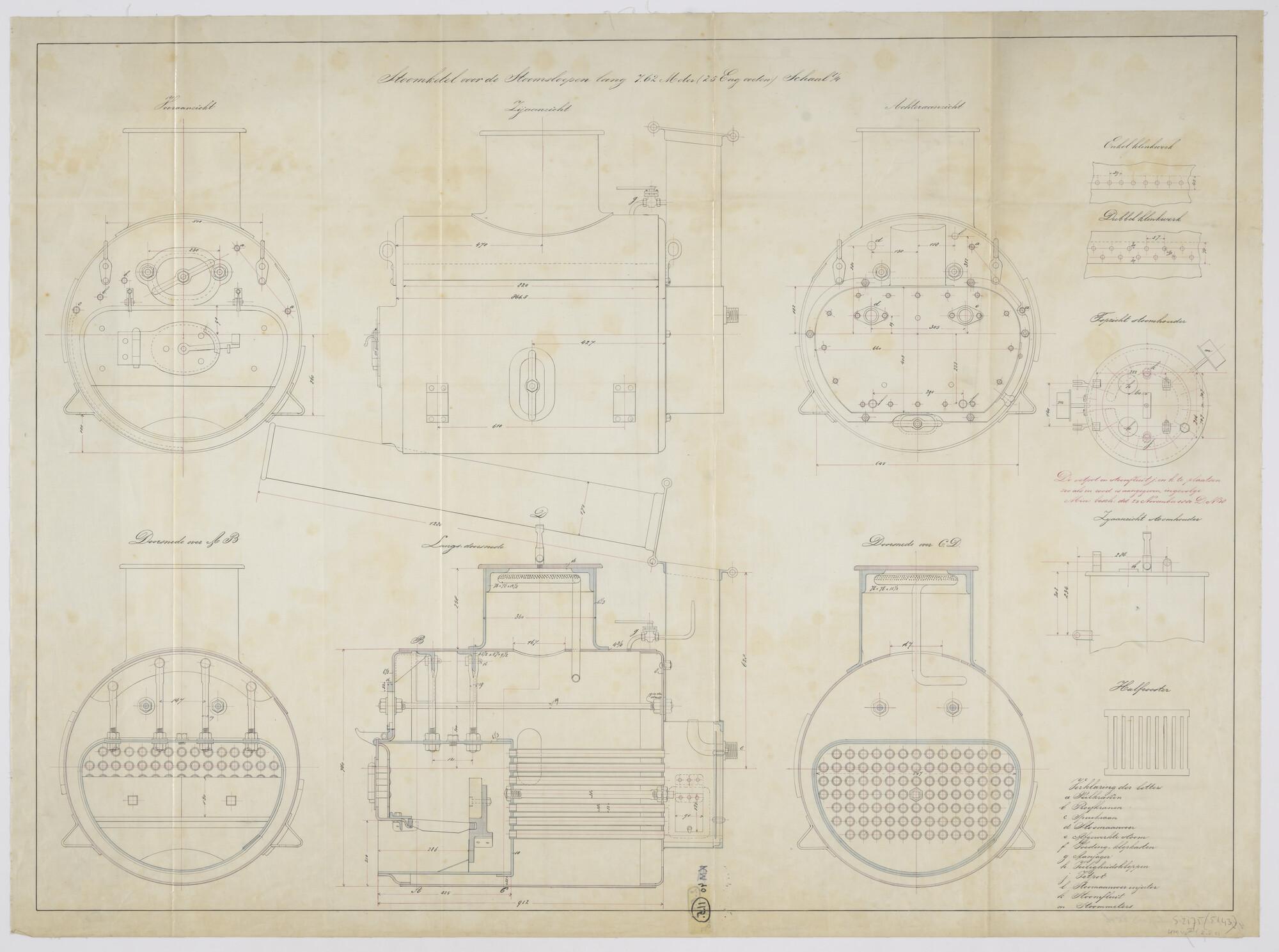 Langs- en dwarsdoorsneden van de stoomketel van het oorspronkelijk Engelse ontwerp bewapende stalen stoomsloep met zeiltuig (S.S.2) lang 25 feet