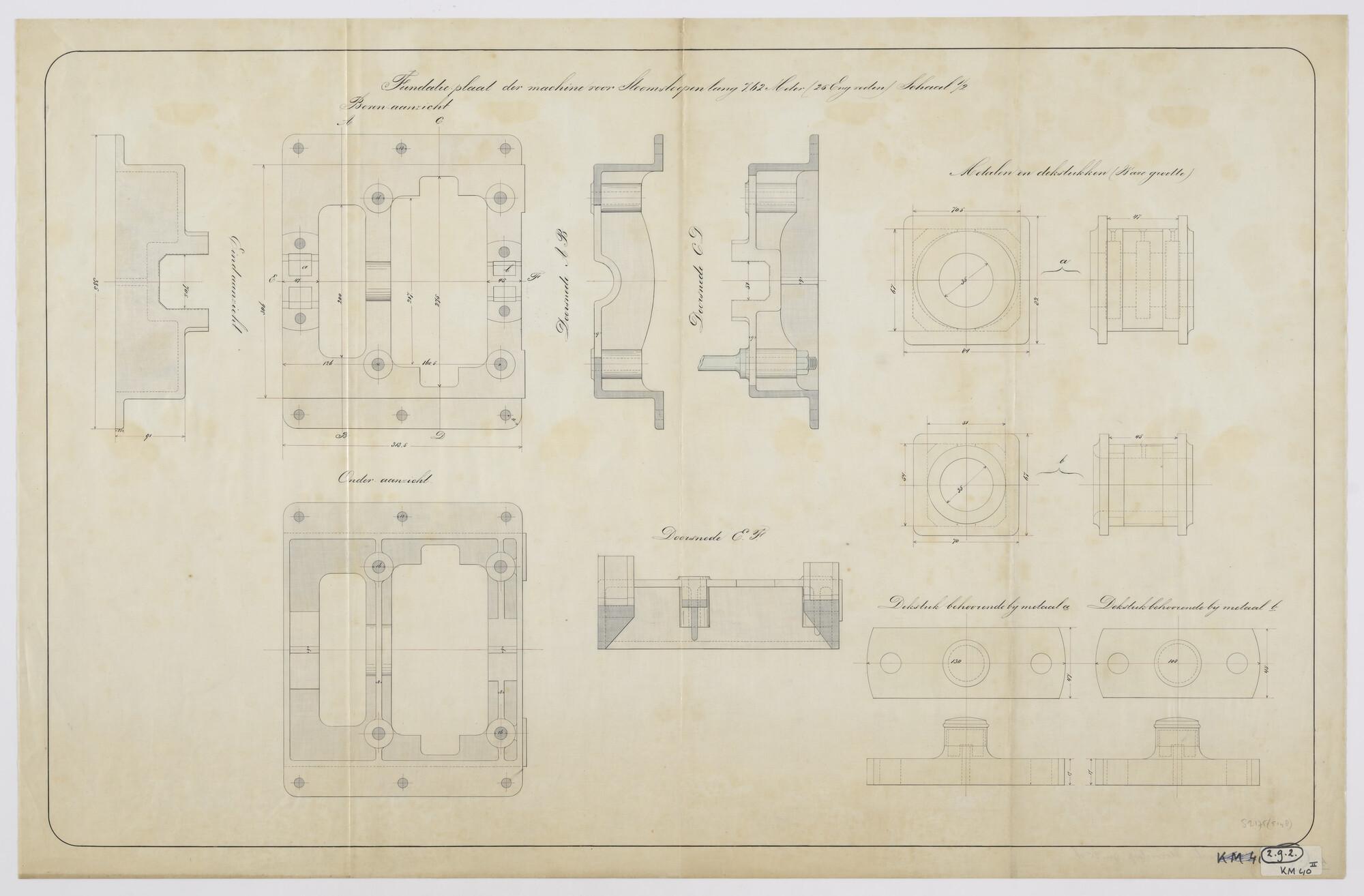 Aanzichten en doorsneden van de fundatieplaat van de stoommachine van het oorspronkelijk Engelse ontwerp bewapende stalen stoomsloep met zeiltuig (S.S.2) lang 25 feet