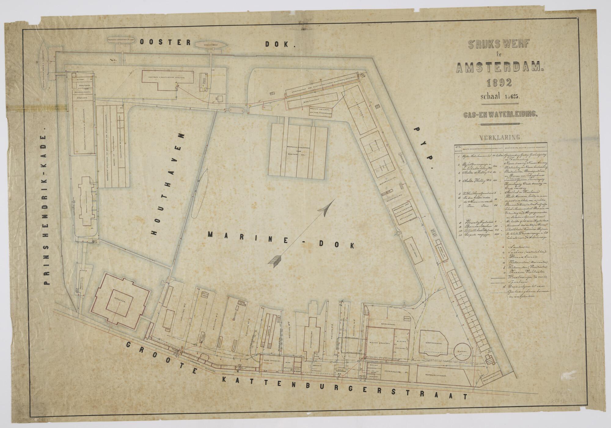Plattegrond van de Rijkswerf te Amsterdam (1892) met gas- en waterleiding. Kaai- en bekledingsmuren; Oosterdok; Groote Kattenburgerstraat; Marine-dok; Houthaven; scheepshellingen; werkplaatsen; magazijnen; bergplaatsen; Groot Magazijn ('s Lands Zeemagazijn); woonhuizen Directie (Het Paleis); Vistorpedomagazijn; ligplaats van het opleidingsschip Hr.Ms. 'Admiraal van Wassenaar'; ligplaats van het Torpedisten-logementschip Hr.Ms. 'Vulkaan'; overdekte hellingen voor stoomkanonneerboten en torpedoboten (schaal 1:625).