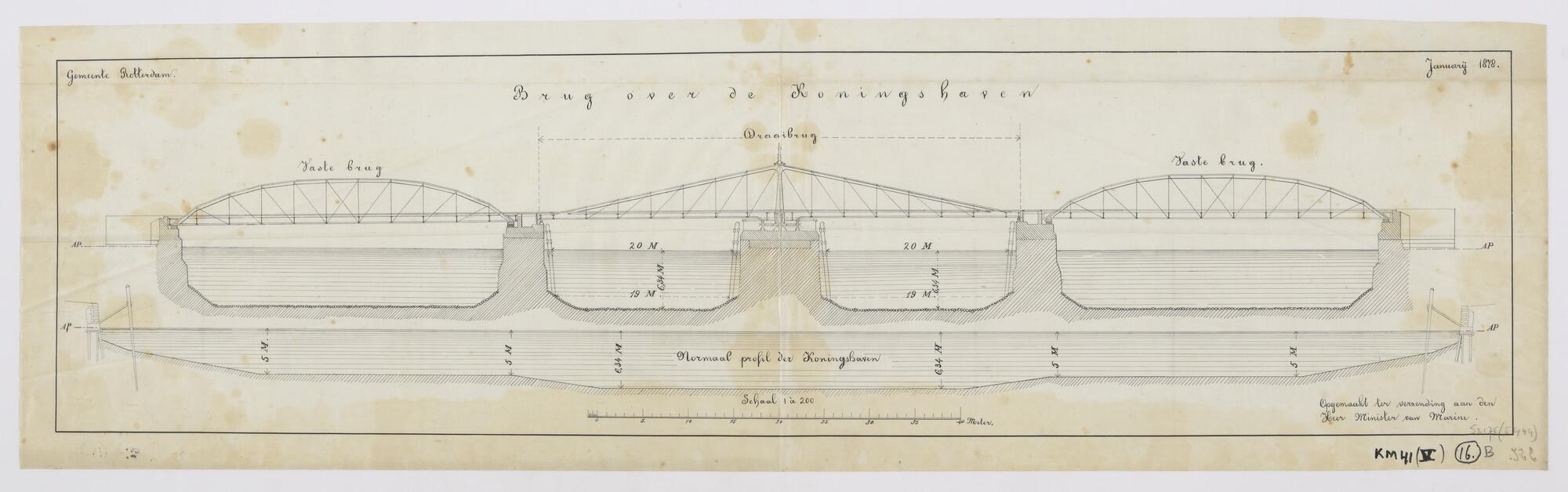 Langsdoorsnede met pijlers, fundatie der pijlers, beide vaste bruggen en de draaibrug over de Koningshaven te Rotterdam. Breedte der beide doorvaartopeningen. Dwarsdoorsnede van het profiel der Koningshaven (schaal 1:200).