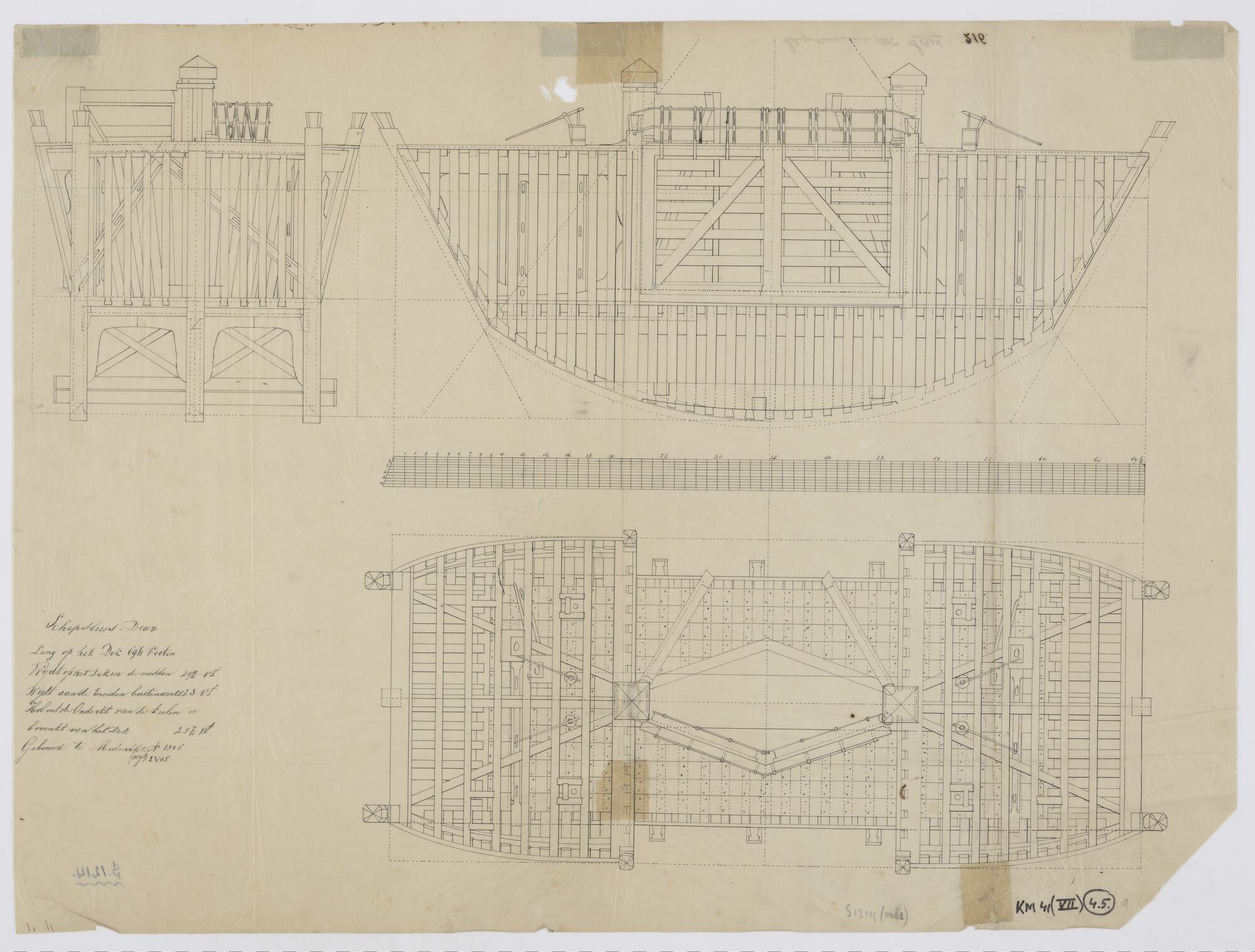 Doorsneden en bovenaanzicht van een schipsluisdeur (bateau-porte met sluisdeur) ter Medemblik (1805) met overzicht van de hoofdafmetingen.
