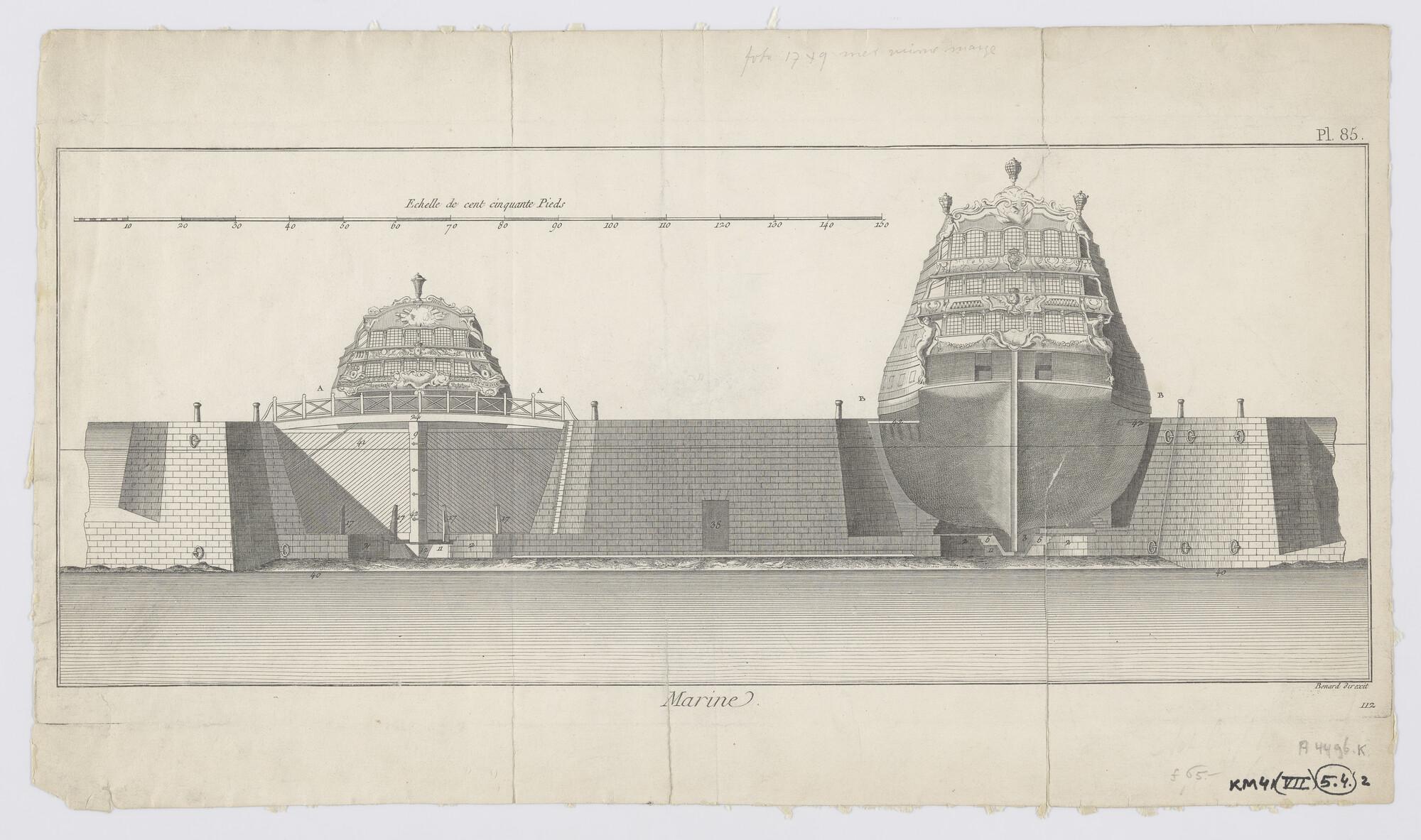 Vooraanzicht van de door A. Choquet de Lindu in 1757 gegraven droogdokken I, II te Brest (Recouvrance) met oorlogsschepen in dok. Niet afgebeeld is in het verlengde van droogdok II, het droogdok III met overkapping. De dokken worden gesloten door dokdeuren (schaal in voeten).