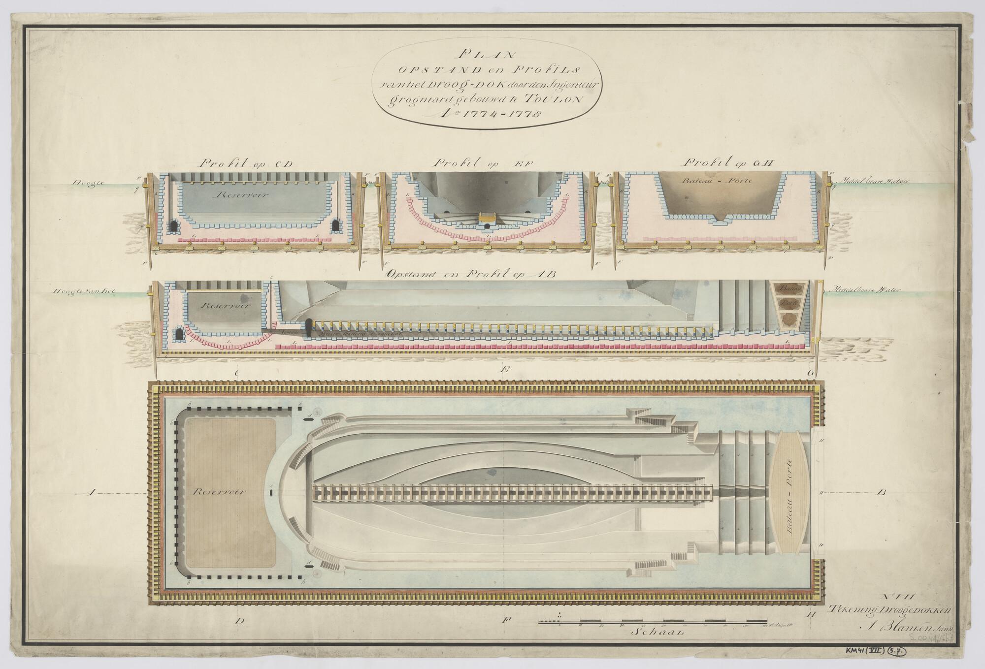 Bovenaanzicht, zijaanzicht en vooraanzichten van het drijvend droogdok te Toulon, ontworpen (1774-1778) door de Fransman Groignard, waarbij gebruik is gemaakt van een afzinkbaar houten caisson dat op de vlakke zeebodem rust en met palen wordt vastgezet. Het dok is voorzien van een bassin (reservoir) en een trapeziumvormige schipdeur (bateau-porte) als afsluiting (schaal in Rhijnlandsche voeten).