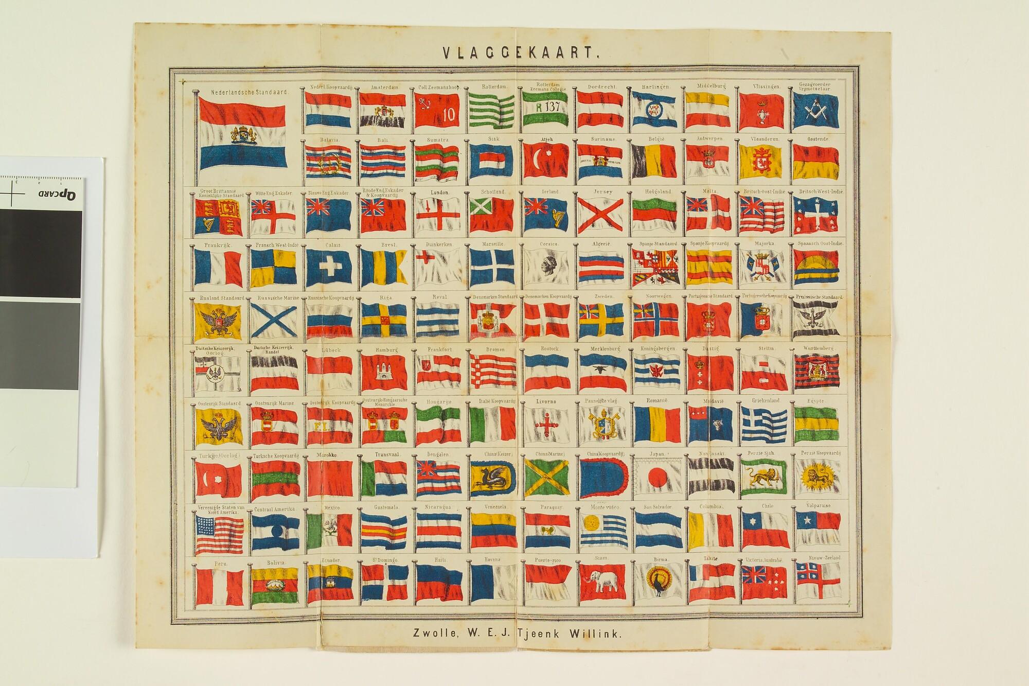 Uitvouwbare vlaggenkaart met 117 vlaggen uit ca. 1890. Eigendom geweest van Marius Jutting. Bijzonder aan deze kaart is de vlag 'kapitein vrijmetselaar'.