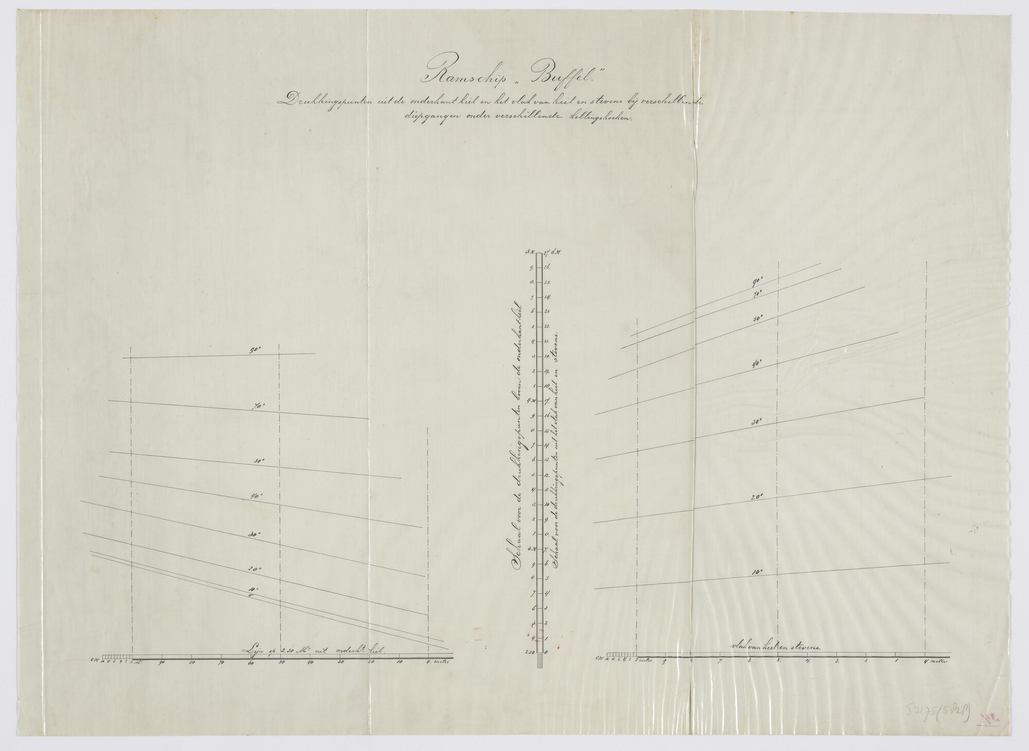 Grafische voorstelliing van drukkingspunten uit de onderkant van de kiel, het vlak van de kiel en stevens bij verschillende diepgangen onder verschillende hellingshoeken aan boord van het ramschip Zr.Ms. 'Buffel'.