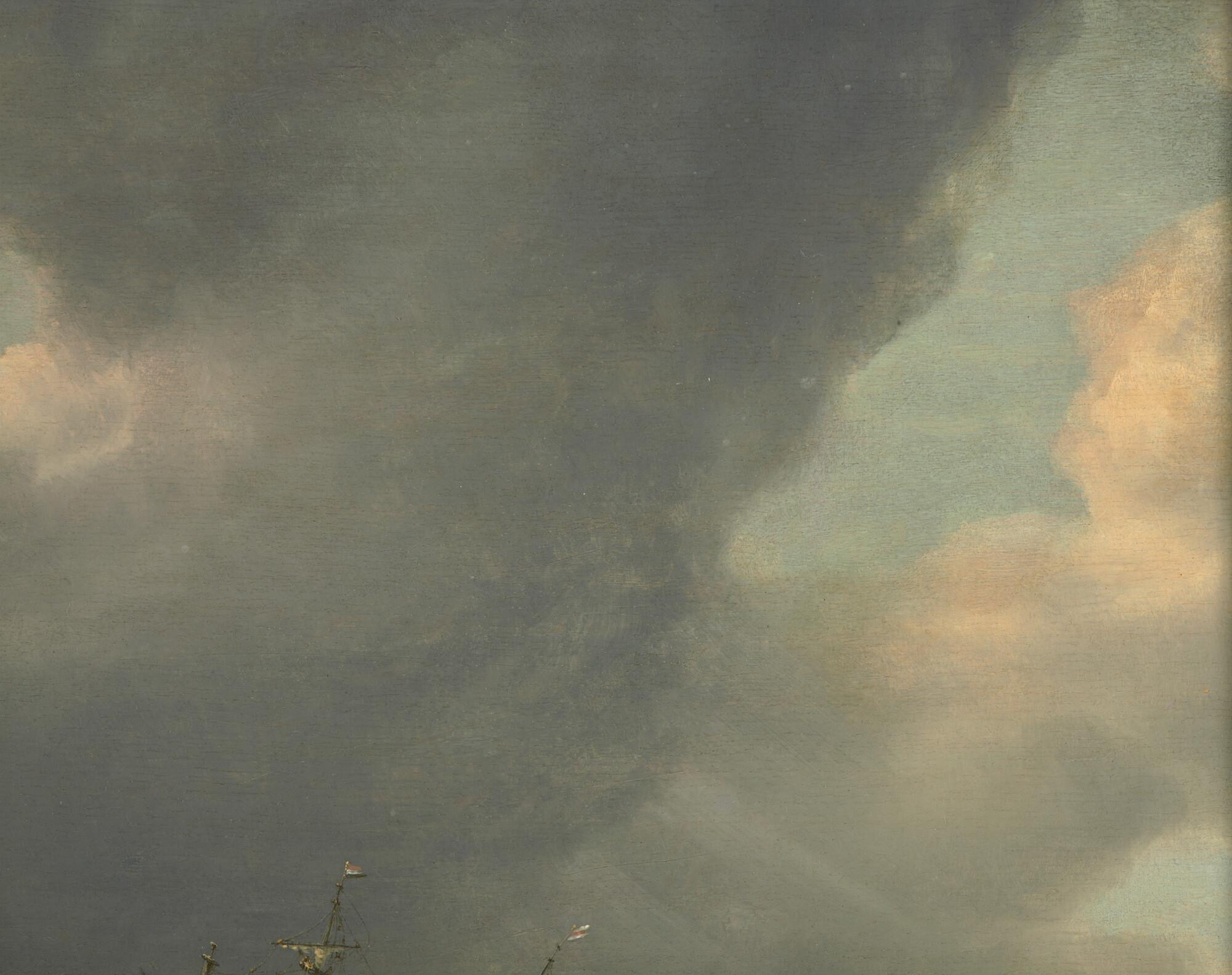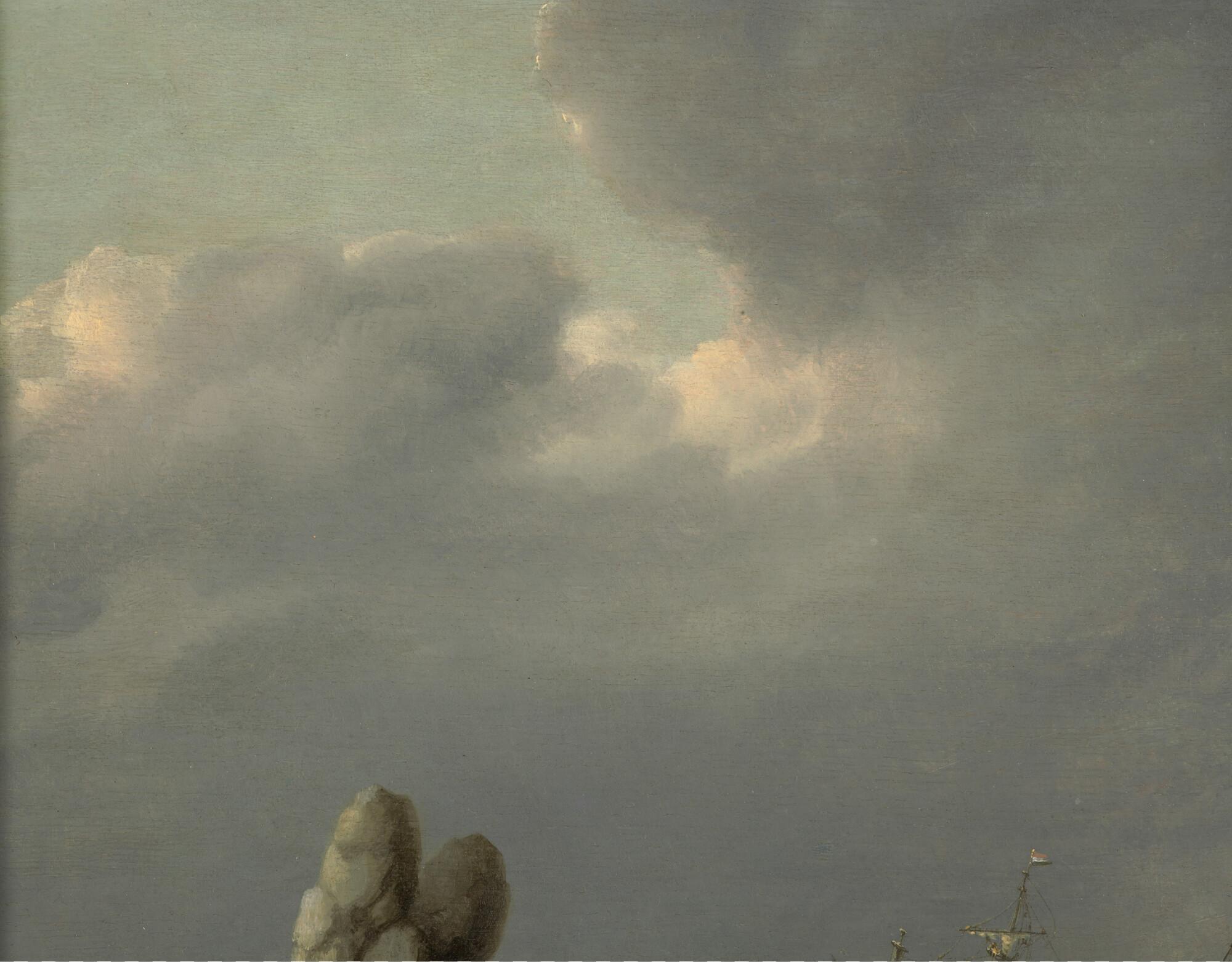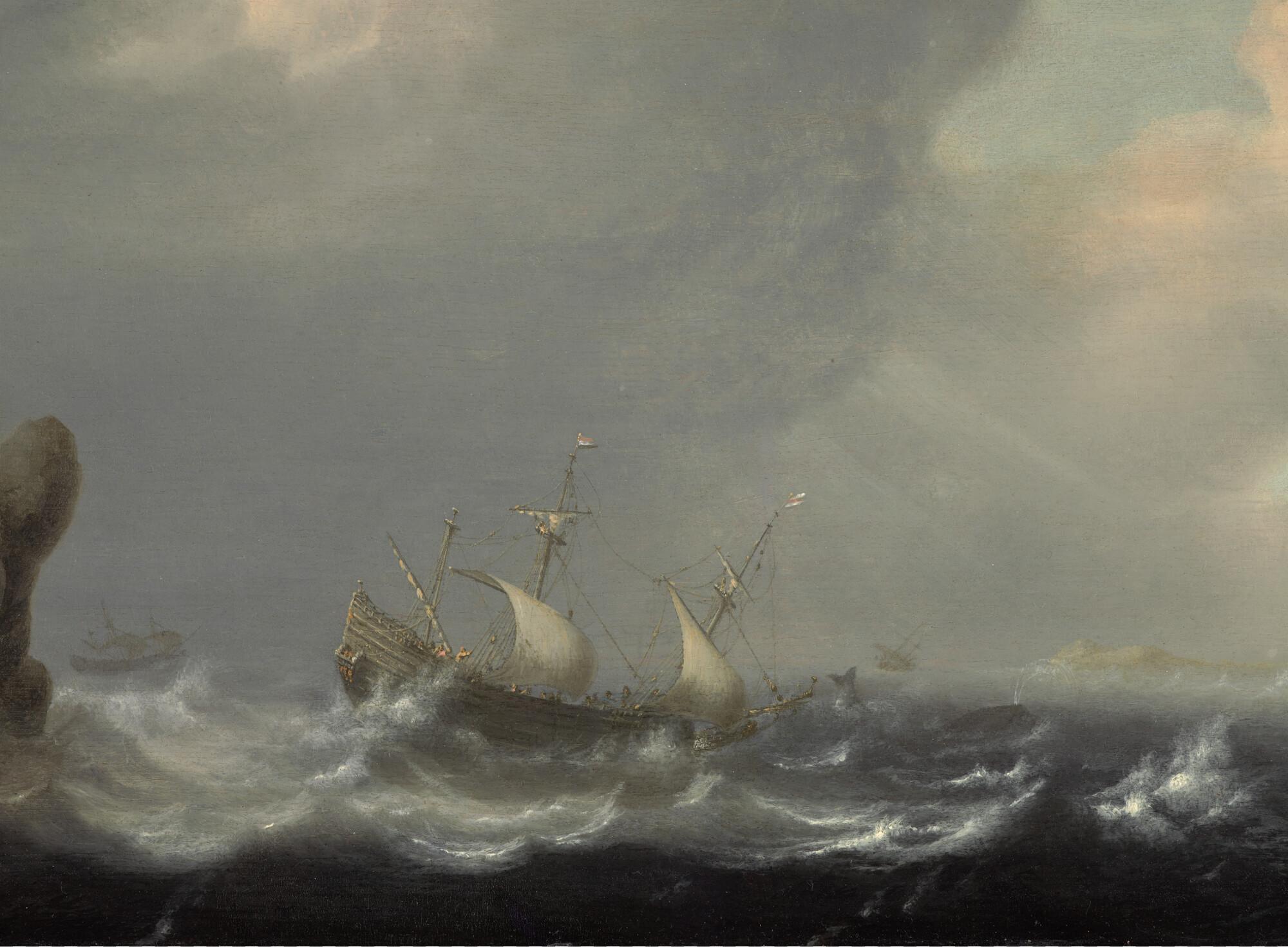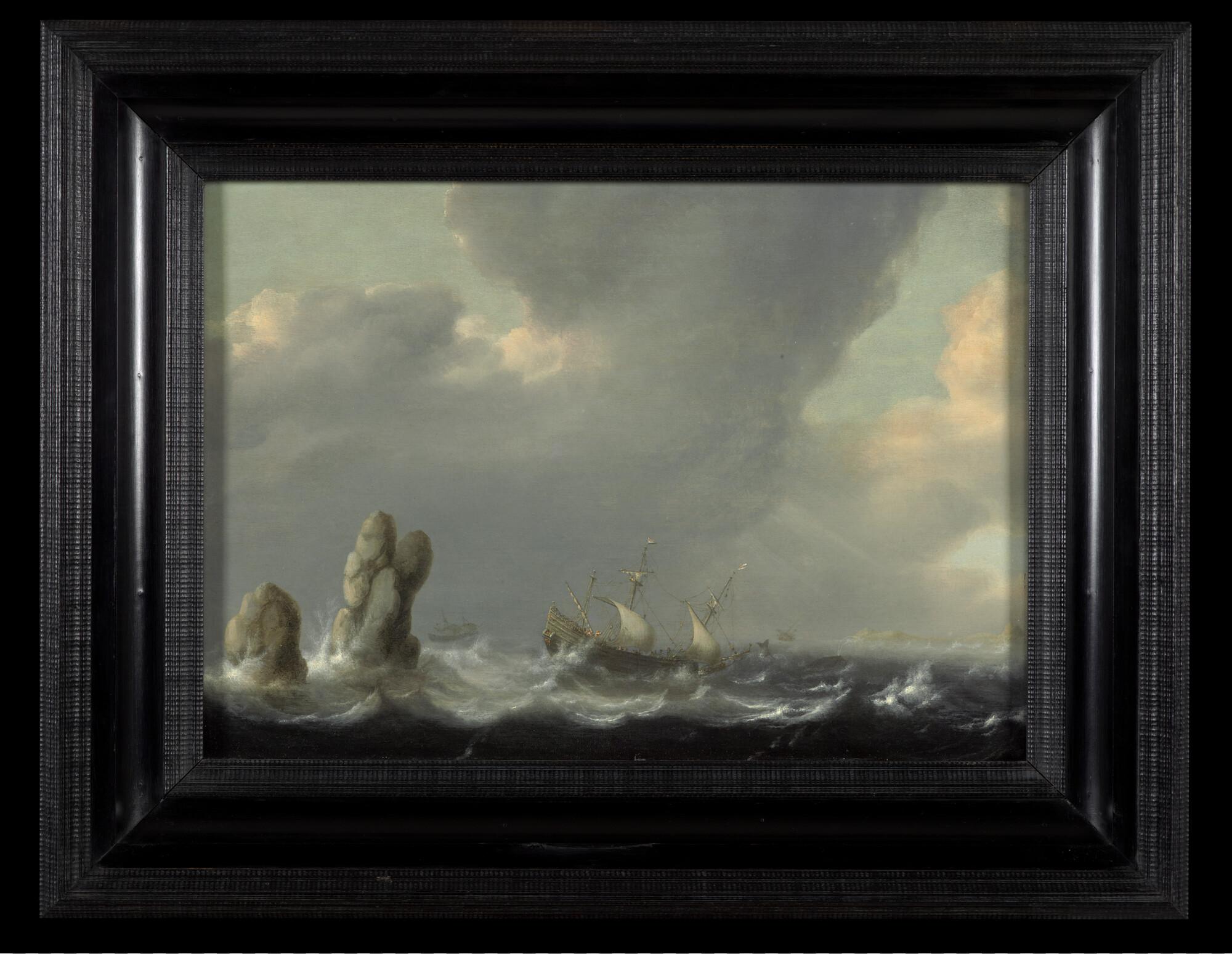 Olieverfschilderij van een schip onder klein zeil op een stormachtige zee bij een rotsformatie (links); rechts in het verschiet een kust, voor het schip een walvis.