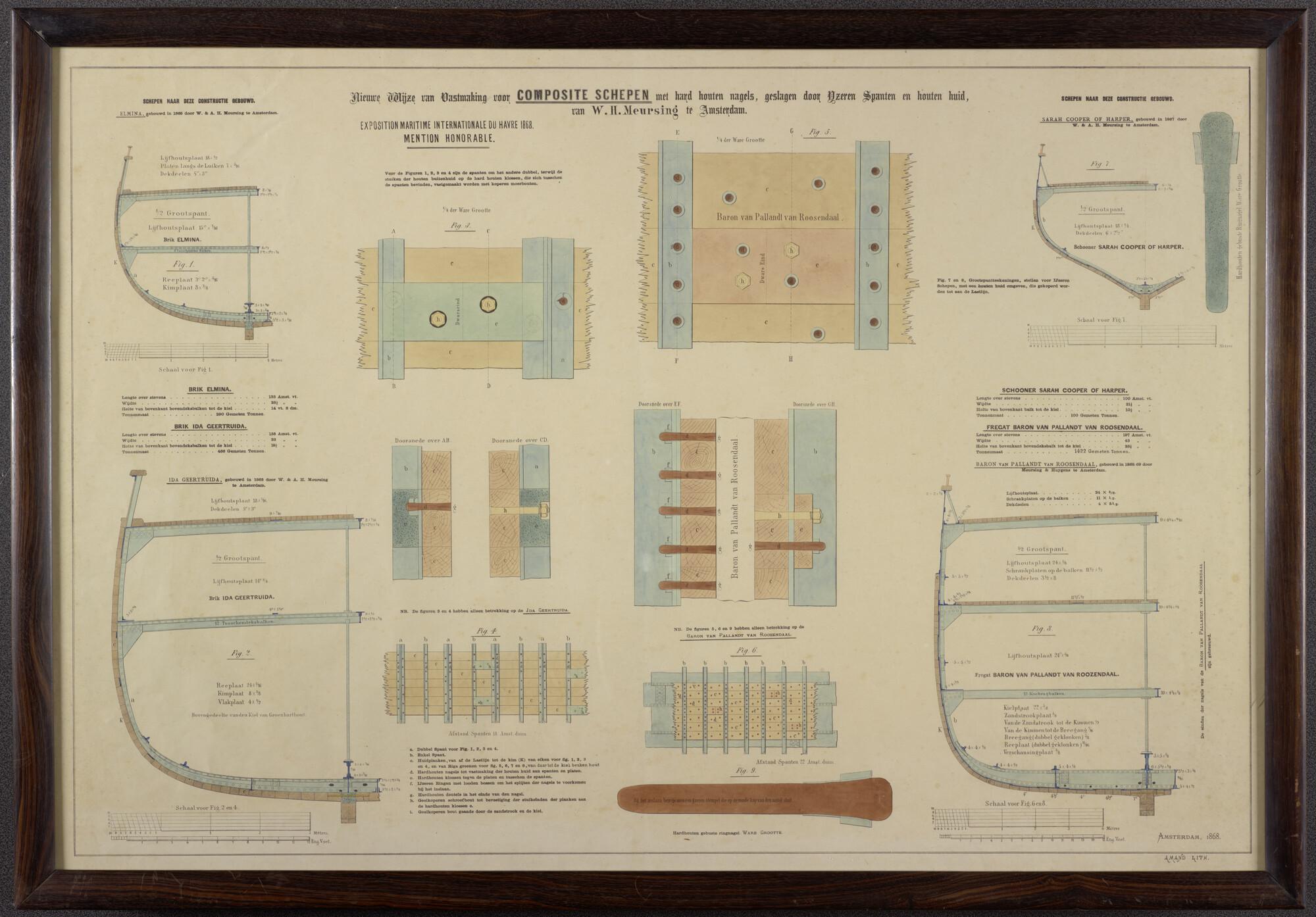 Reclameplaat voor composietbouw van de scheepswerf van W.H. Meursing te Amsterdam, met afbeeldingen van doorsneden van schepen, gebouwd volgens dit systeem.