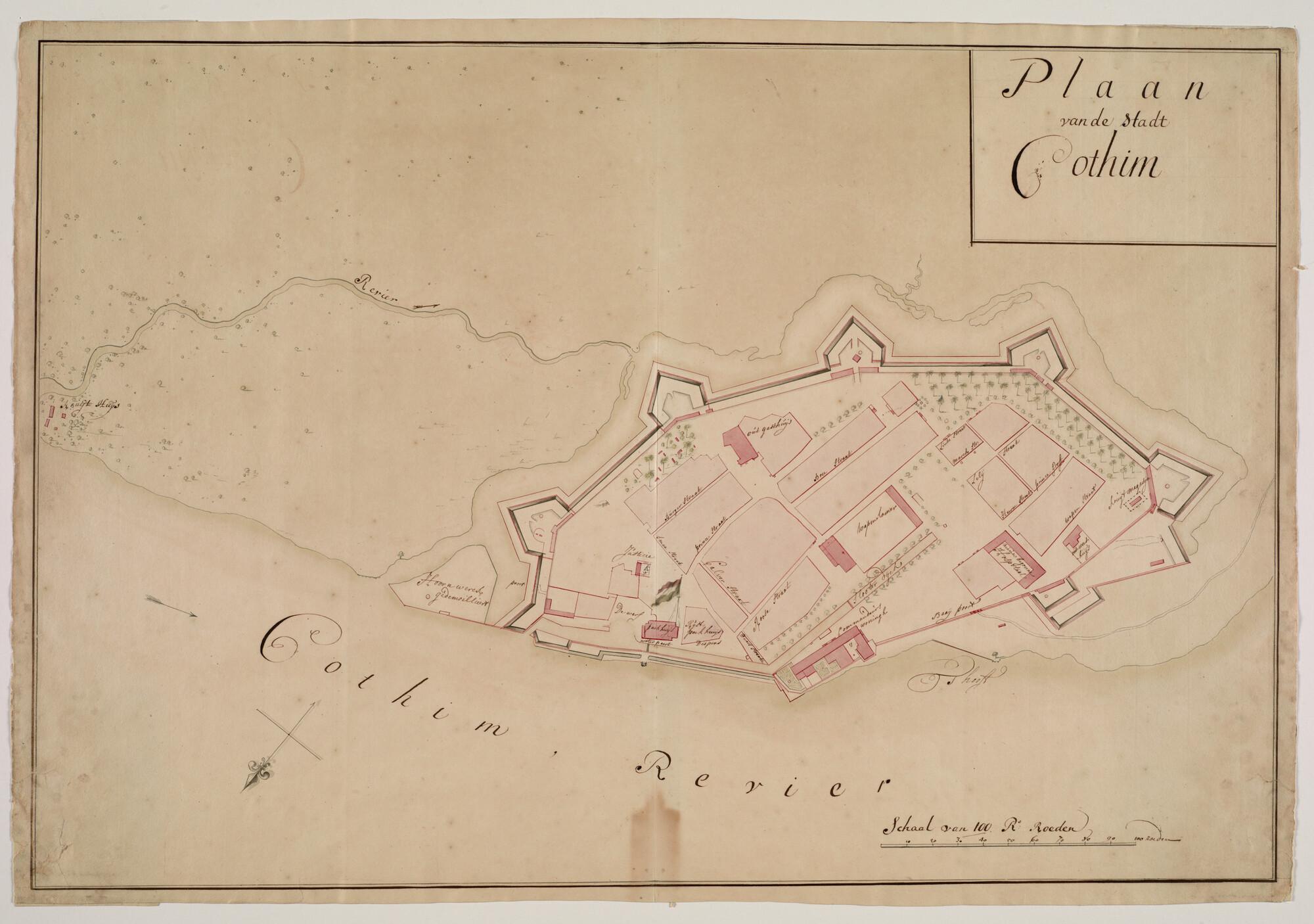 Gekleurde handschriftkaart van de stad Cothim (het huidige Cochin / Kochi) in Malabar. De kaart is een van een serie van zeven handschriftkaarten van forten en vestigingen van de VOC langs de kust en een grote overzichtskaart van de kust van Malabar.