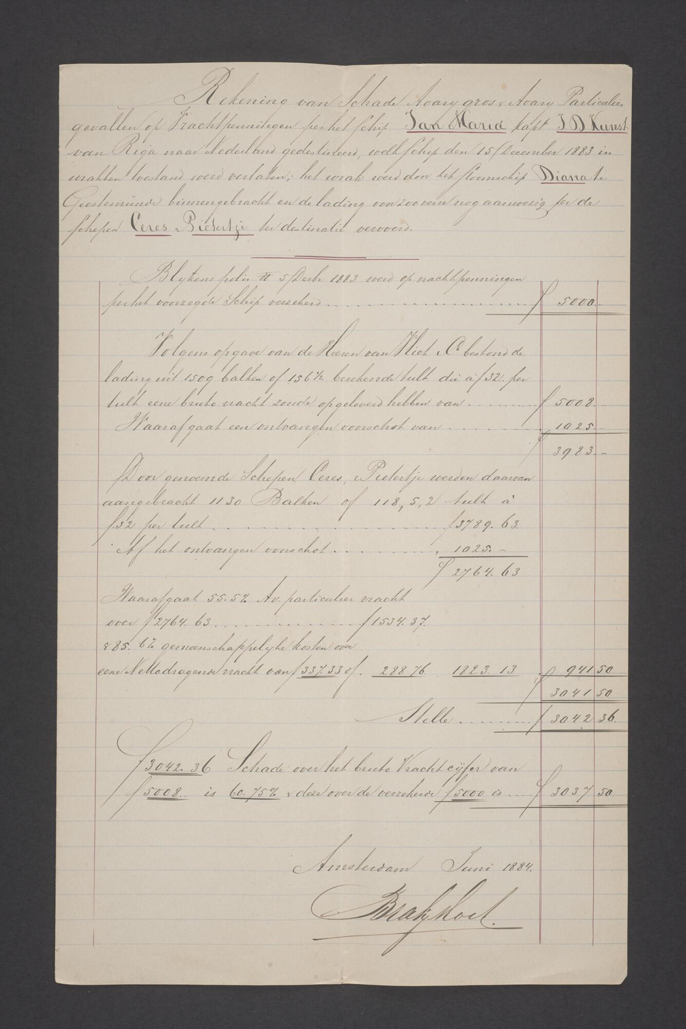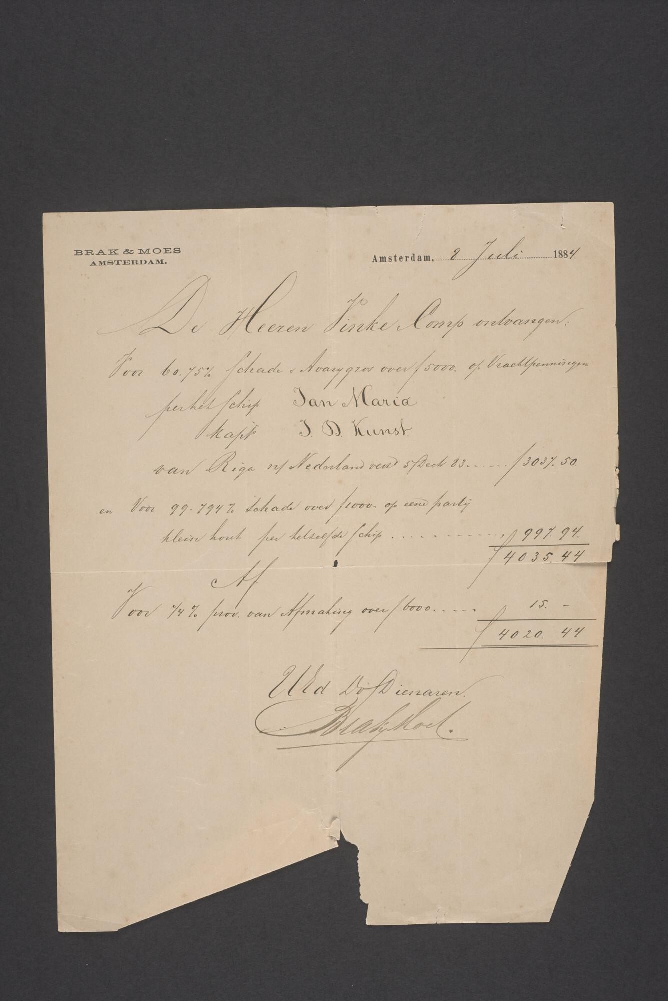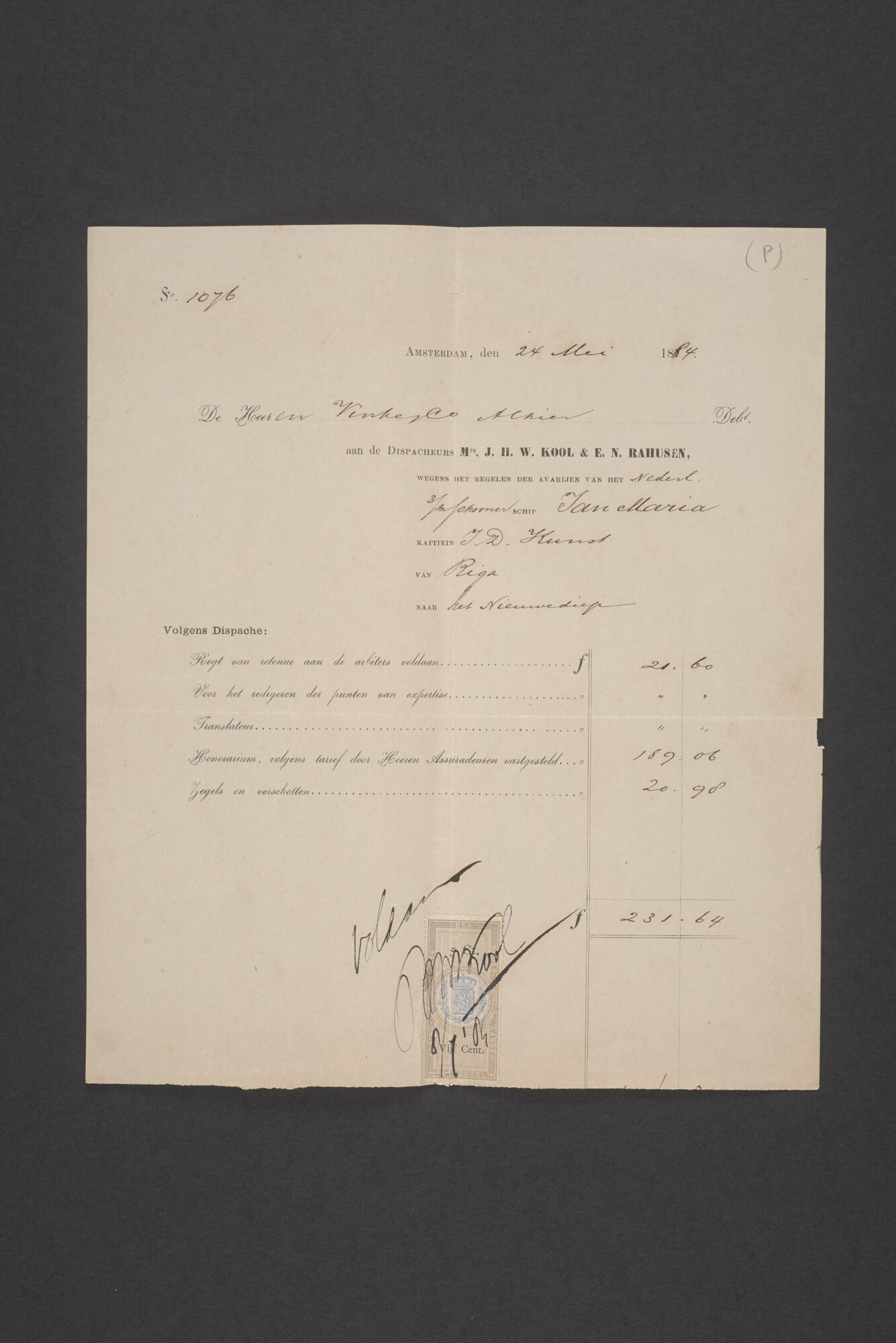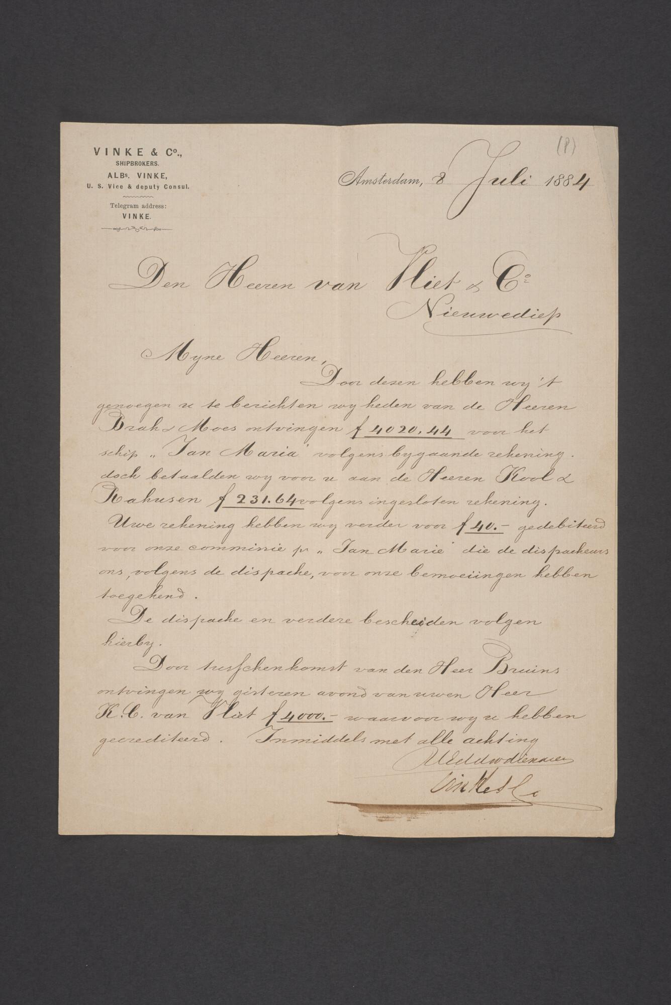 Brief met bijlagen van de Firma Vinke & Co te Amsterdam aan de firma van Vliet & Co. te Nieuwediep over betalingen gedaan in de Averijzaak van de schoener 'Jan Maria gevoerd door Kapitein J. D. Kunst op de reis van Riga naar het Nieuwediep verlaten binnengebracht te Geestemünde.