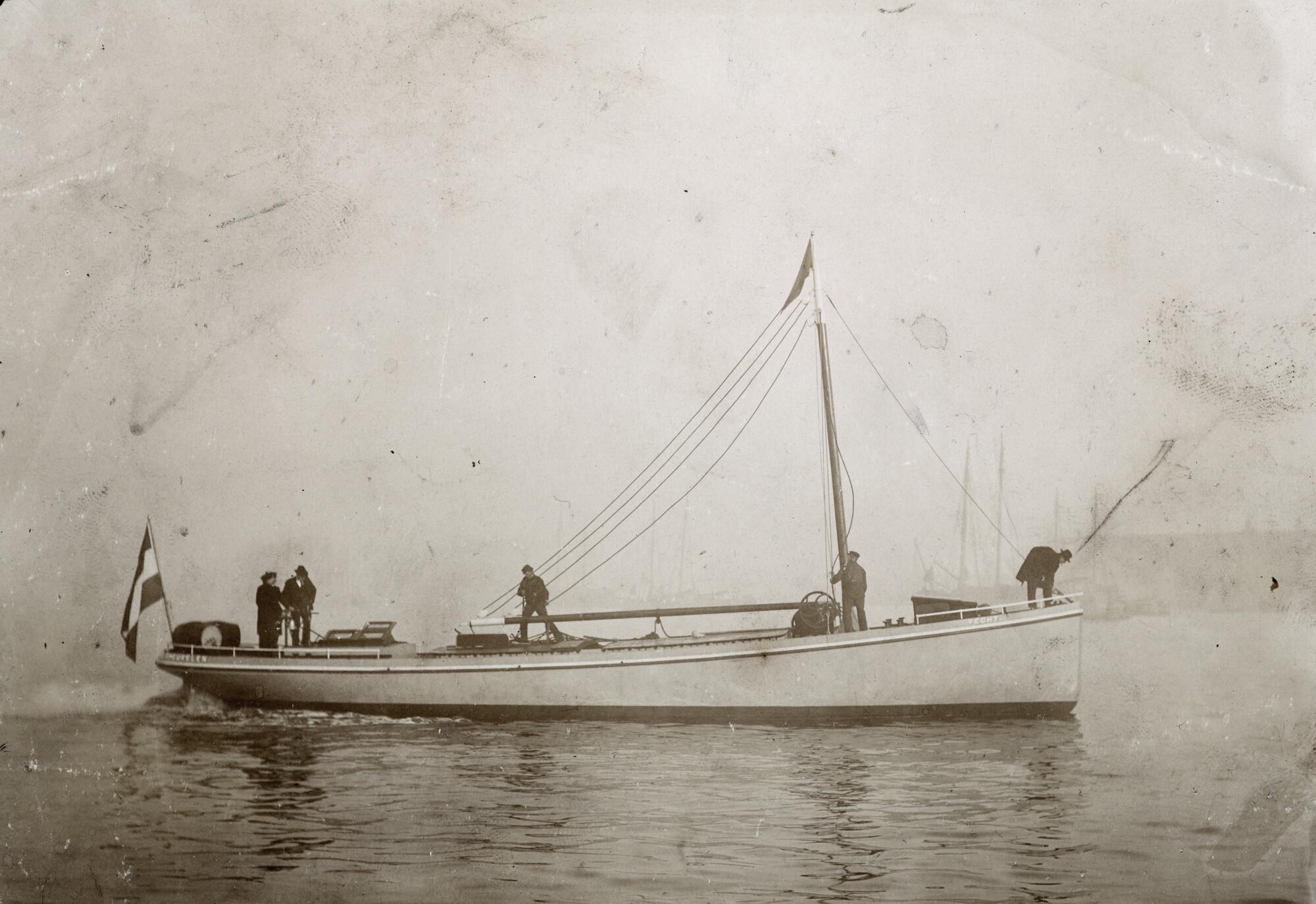 Zijaanzicht over stuurboord van een 50 ton motorvrachtboot met mast en giek varend op het IJ. Rechte voorsteven en ronde achtersteven. Deutz 12PK petroleum-motor. Afmetingen: lengte 18 m, breedte 3.60 m, diepgang 1.50 m.
