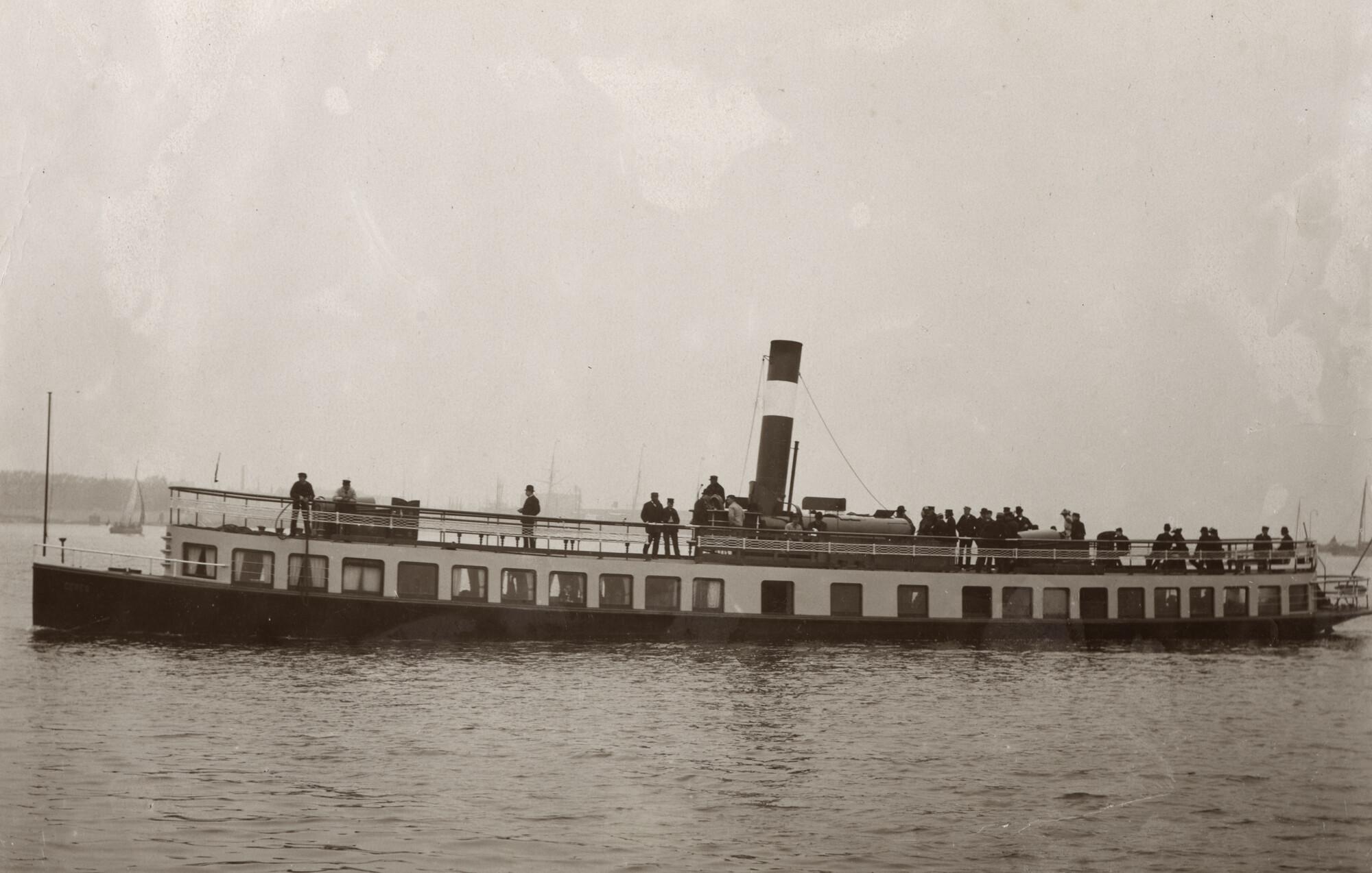 Zijaanzicht van het stoompassagiersschip 'Ceres' op het IJ, gebouwd bij de scheepswerf 't Kromhout aan de Nieuwe Vaart te Amsterdam en bestemd voor de dienst Amsterdam - Velsen - IJmuiden. Grote ramen van de salon. Bovendek met reeling en passagiers accommodatie (zitbanken). Hoge schoorsteen in de midscheeps Rechte voorsteven en overhellende achtersteven. Afmetingen: lengte 37.85 ...