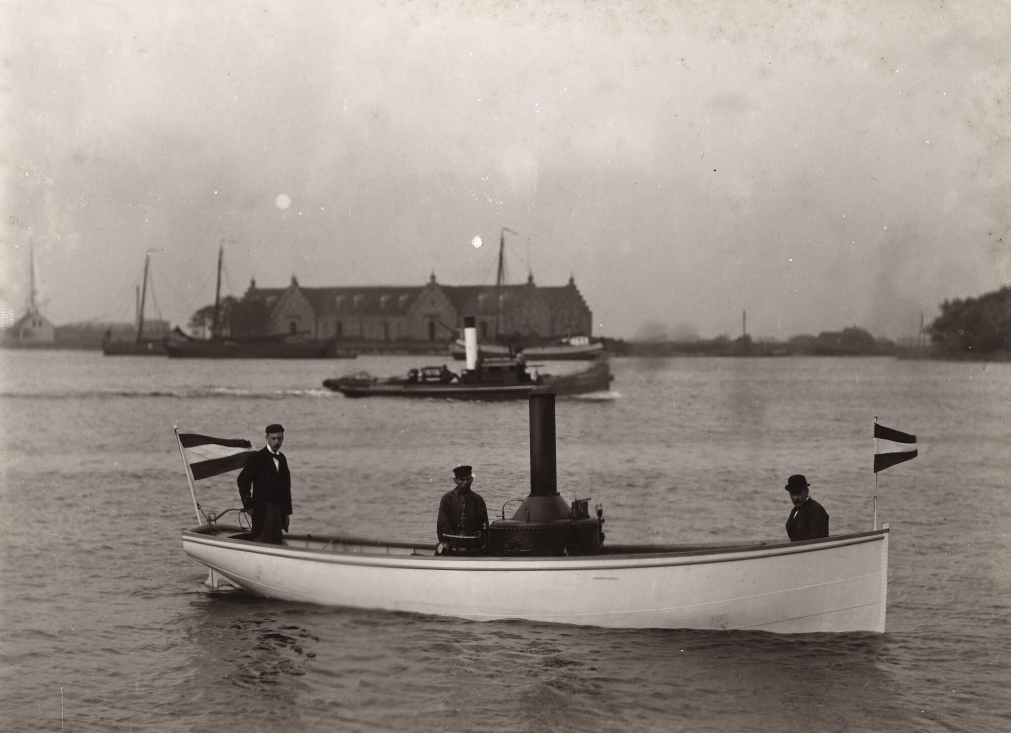 Stoomsloep van 7 meter tijdens haar proeftocht op het IJ nabij het Petroleum Entrepôt en het Tolhuis