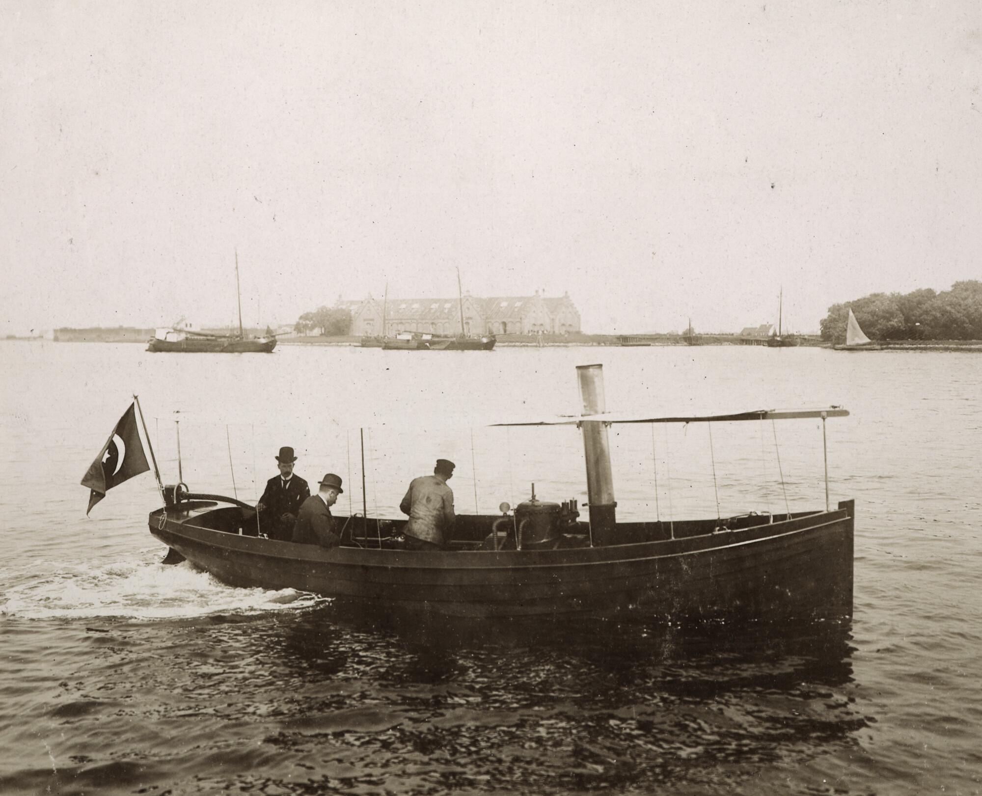 Zijaanzicht over stuurboord van een open houten stoomsloep gebouwd bij de scheepswerf 't Kromhout aan de Nieuwe Vaart te Amsterdam. Rechte voorsteven en platte spiegel. Roer met helmstok. 20 IPK stoommachine met hoge schoorsteen in de midscheeps. Voorschip met constructie voor een dektent. Afmetingen: lengte 7m, breedte 2.10 m, diepgang 1 m.