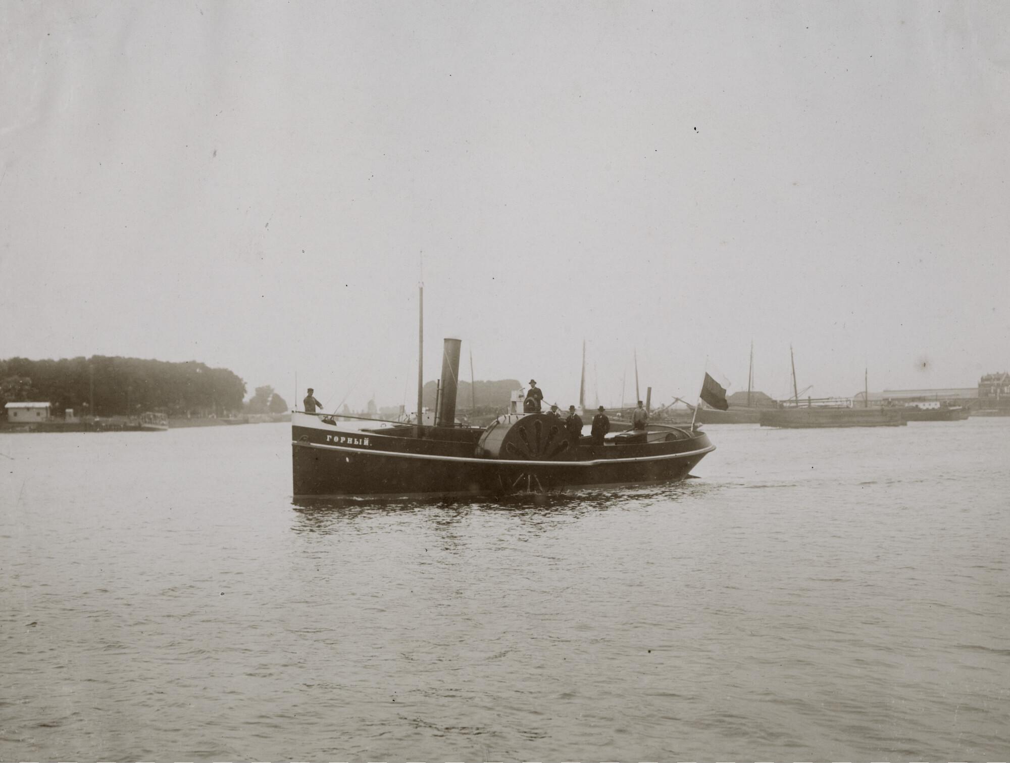 Zijaanzicht over bakboord van het open stoomradersleepboot 'Gorny' gebouwd bij de scheepswerf 't Kromhout aan de Nieuwe Vaart te Amsterdam. Rechte voorsteven en ronde achtersteven. Mast, schoorsteen met raderkast. Boven de raderkast de stuurpositie en een kompas. Achterschip met beting. 60-IPK stoommachine. Afmetingen: lengte 16 m, breedte 4.20 m, diepgang 2 m. Breedte over de ...