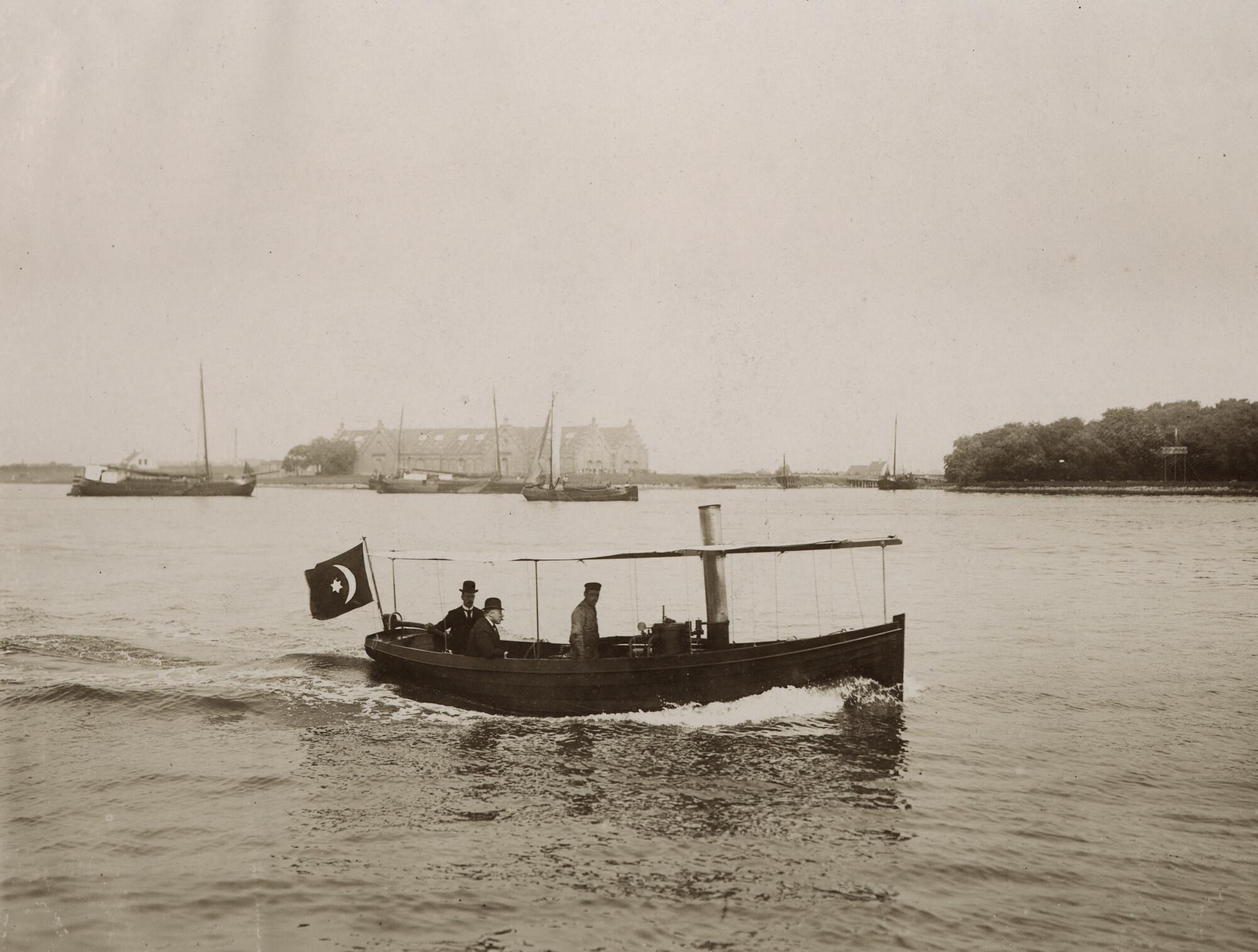 Zijaanzicht over stuurboord van een open houten stoomsloep gebouwd bij de scheepswerf 't Kromhout aan de Nieuwe Vaart te Amsterdam. Rechte voorsteven en platte spiegel. Roer met helmstok. 20 IPK stoommachine met hoge schoorsteen in de midscheeps. Voorschip met constructie voor een dektent. Afmetingen: lengte 7m, breedte 2.10 m, diepgang 1 m.