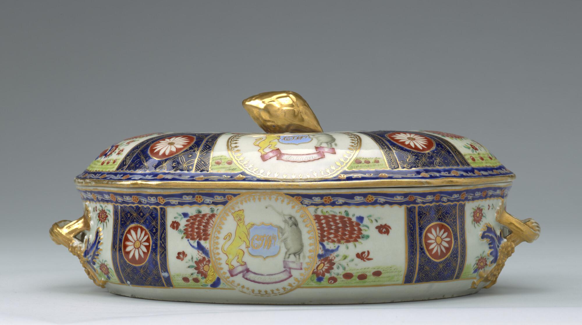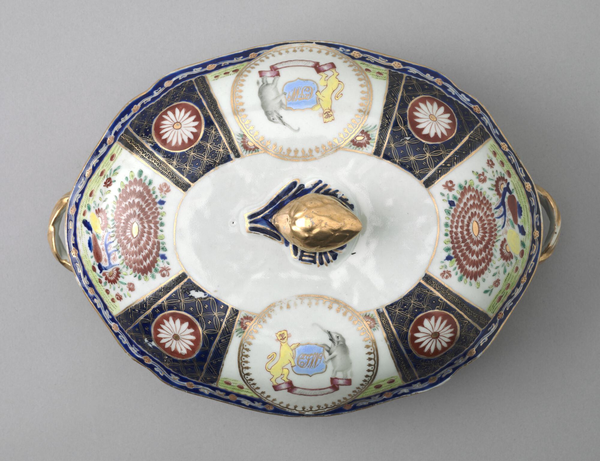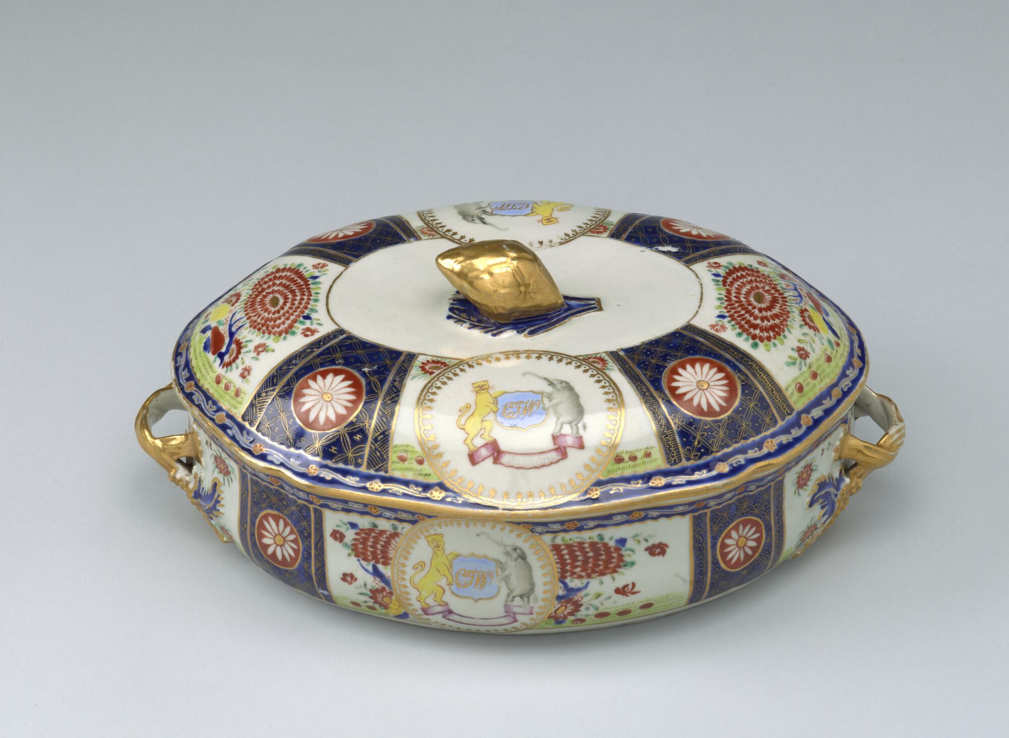 Kleine, ovale terrine van Chinees porselein met los deksel. Gedecoreerd met een polychroom wapenschild gedragen door een tijger en een olifant. In het wapenschild het monogram "CJW" en daaronder het opschrift "Malacca".