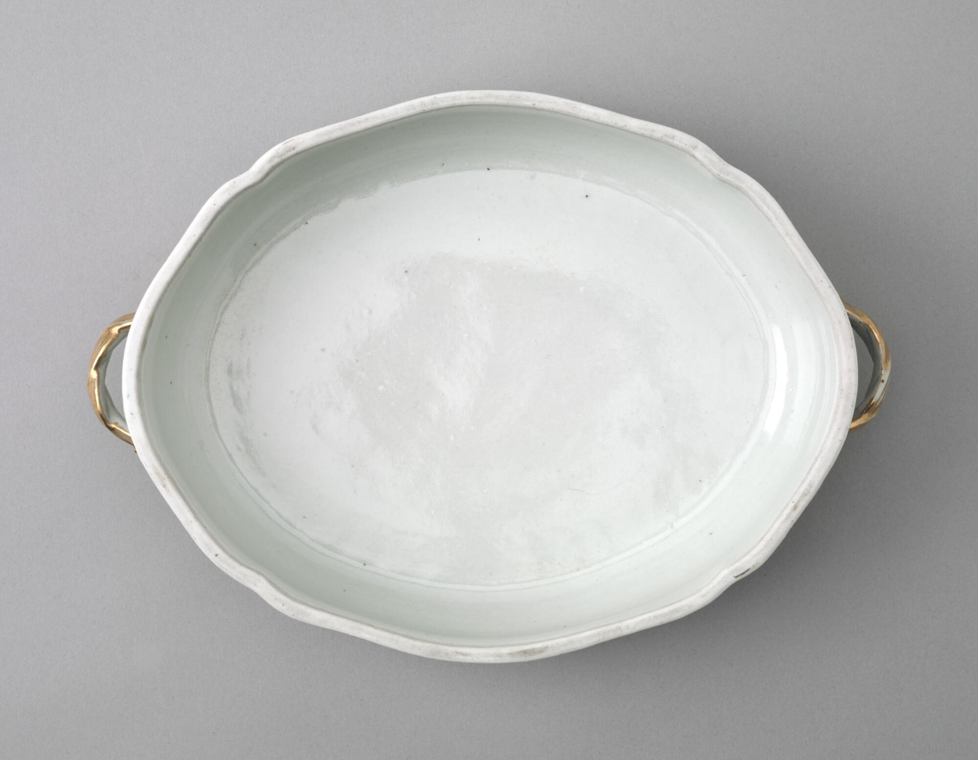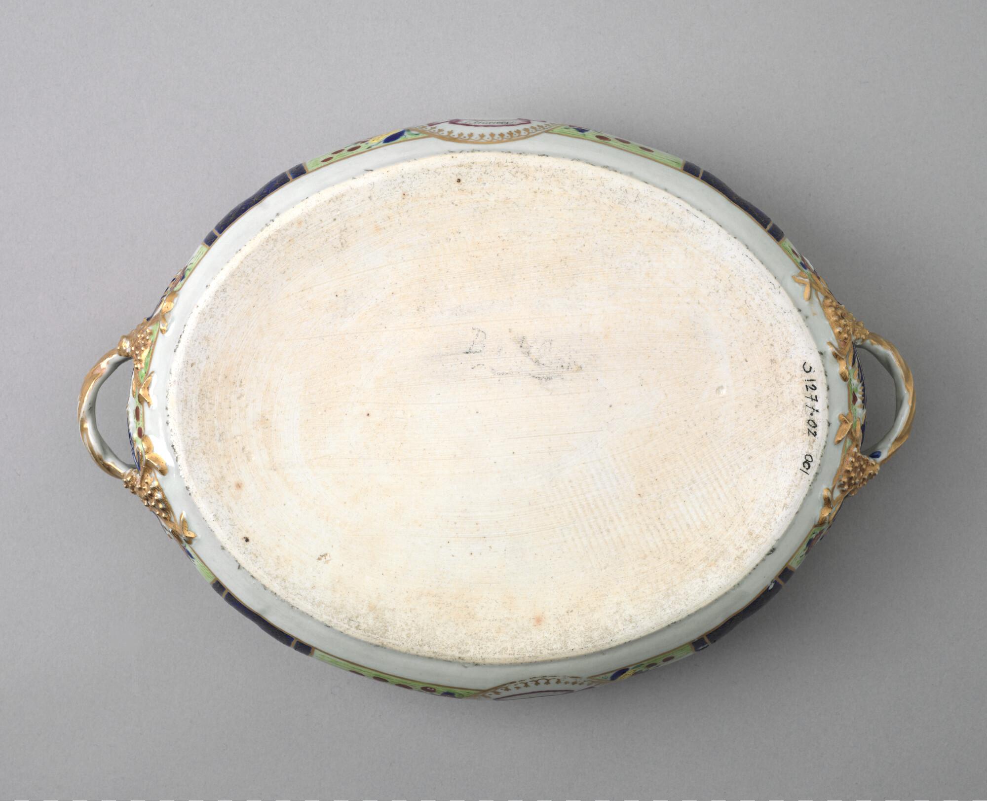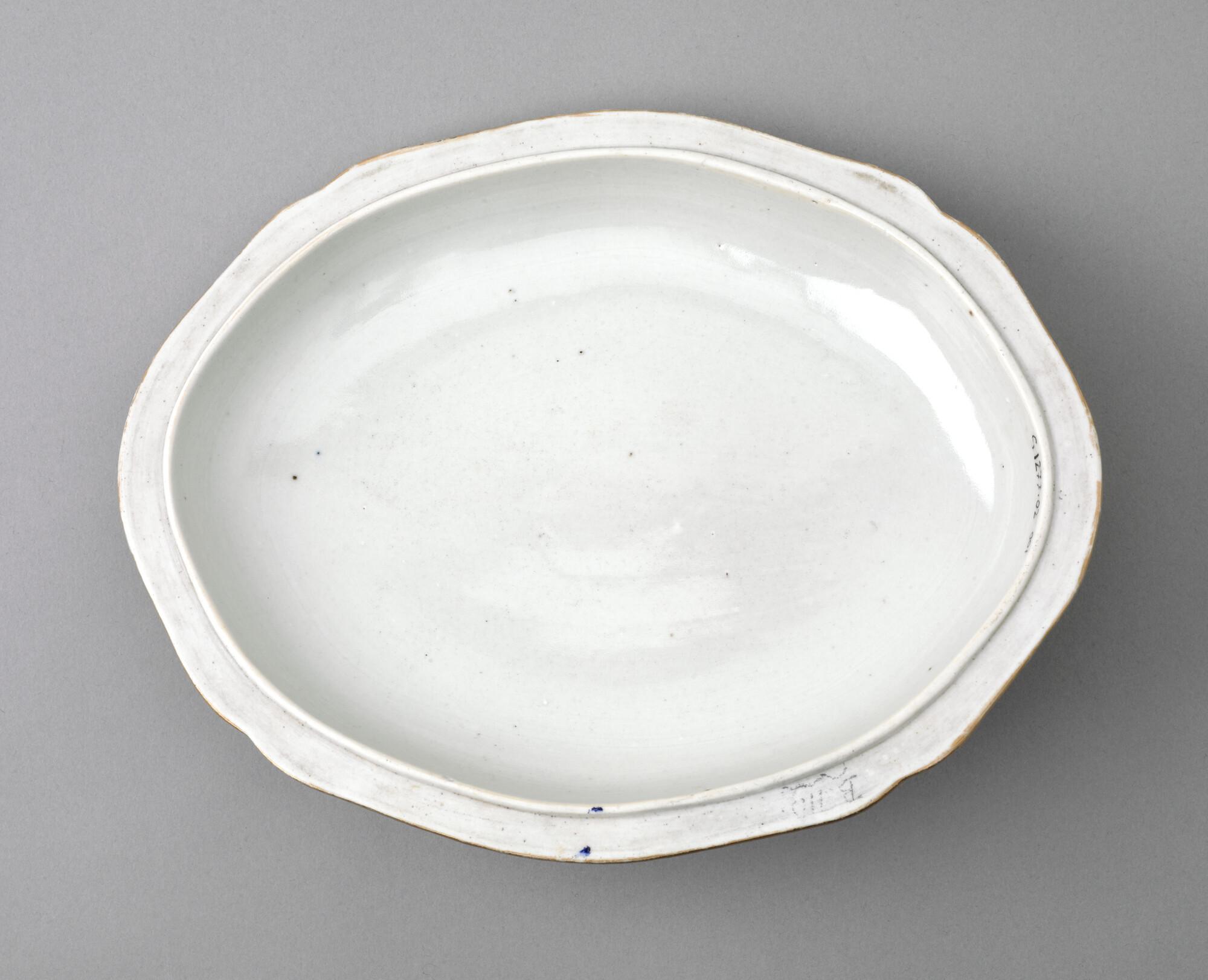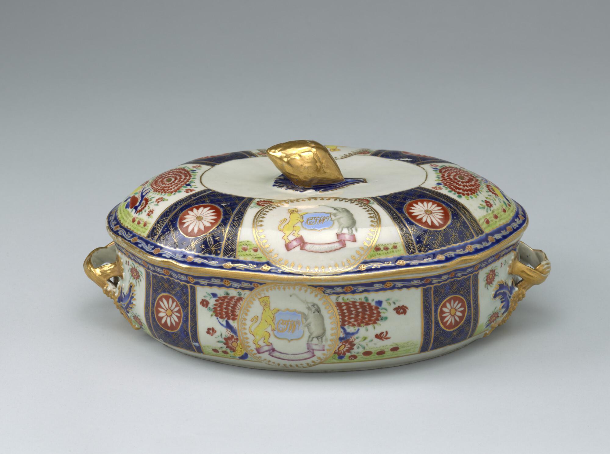 Kleine, ovale terrine van Chinees porselein met los deksel. Gedecoreerd met een polychroom wapenschild gedragen door een tijger en een olifant. In het wapenschild het monogram "CJW" en daaronder het opschrift "Malacca".