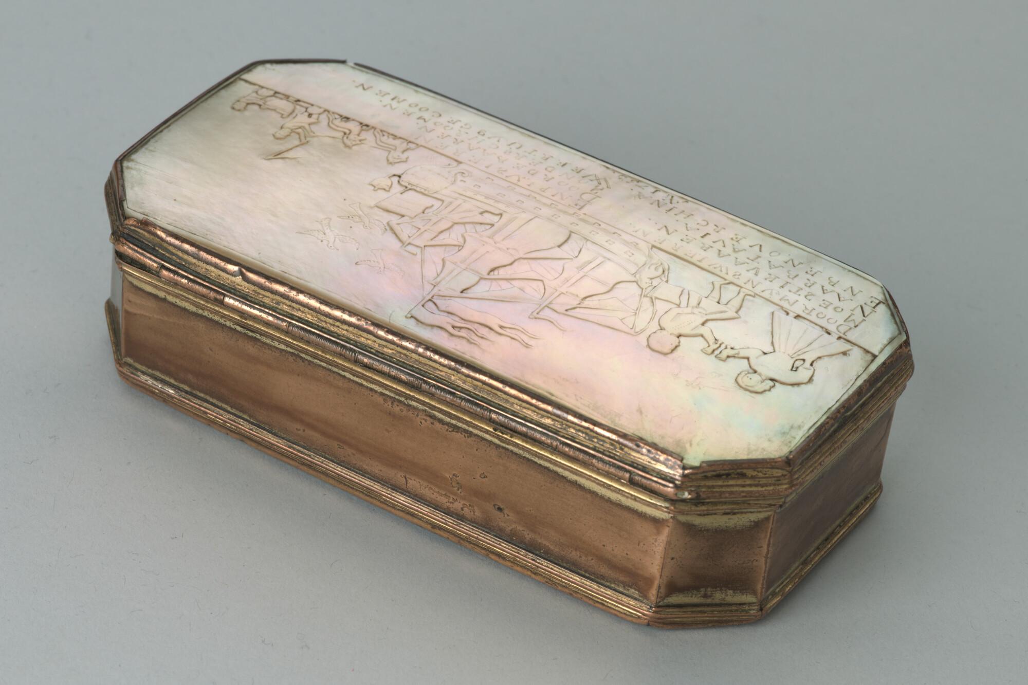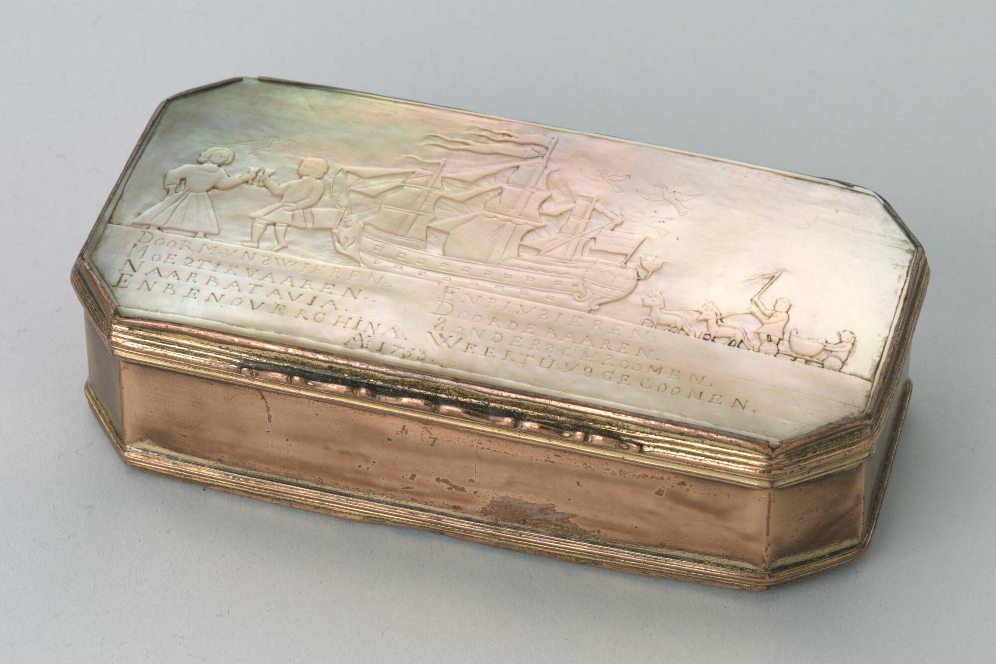 Messing tabaksdoos met een parelmoeren deksel en bodem. Het deksel is gedecoreerd met een gesneden voorstelling van een proostende man en vrouw, een driemaster en een door vier paarden voortgetrokken koetsje met daarin een kind. Onder de voorstelling is een vierregelig versje gegraveerd: 'Door mijn swieren en plysieren / Moest ik vaaren door de baaren ...