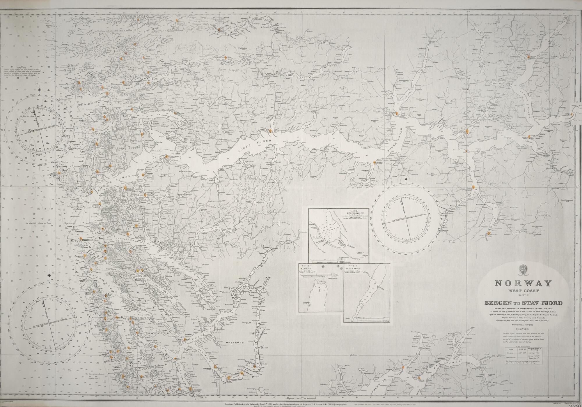 Zeekaart nummer 2291 van Bergen tot Stav Fjord aan de westkust van Noorwegen. De kaart komt uit een collectie kaarten van de Nederlandse en Britse Hydrografische Dienst van diverse gebieden uit de twintigste eeuw.