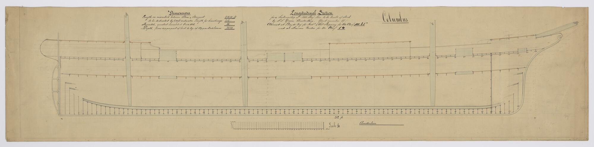 Verticale langsdoorsnede over het casco van het stalen barkschip 'Columbus' uit 1893. Opbouw dekhuizen, drie masten, boegspriet, hoofddek, tussendek. Lloyds reg.class 100A1*. Bureau Veritas classe 1*. Afmetingen: lengte over de stevens 65.60 m, breedte 11 m, diepgang 2.45 meter. Zeiloppervlak (bij de wind) 1830,98 m2 (schaal 1:50).