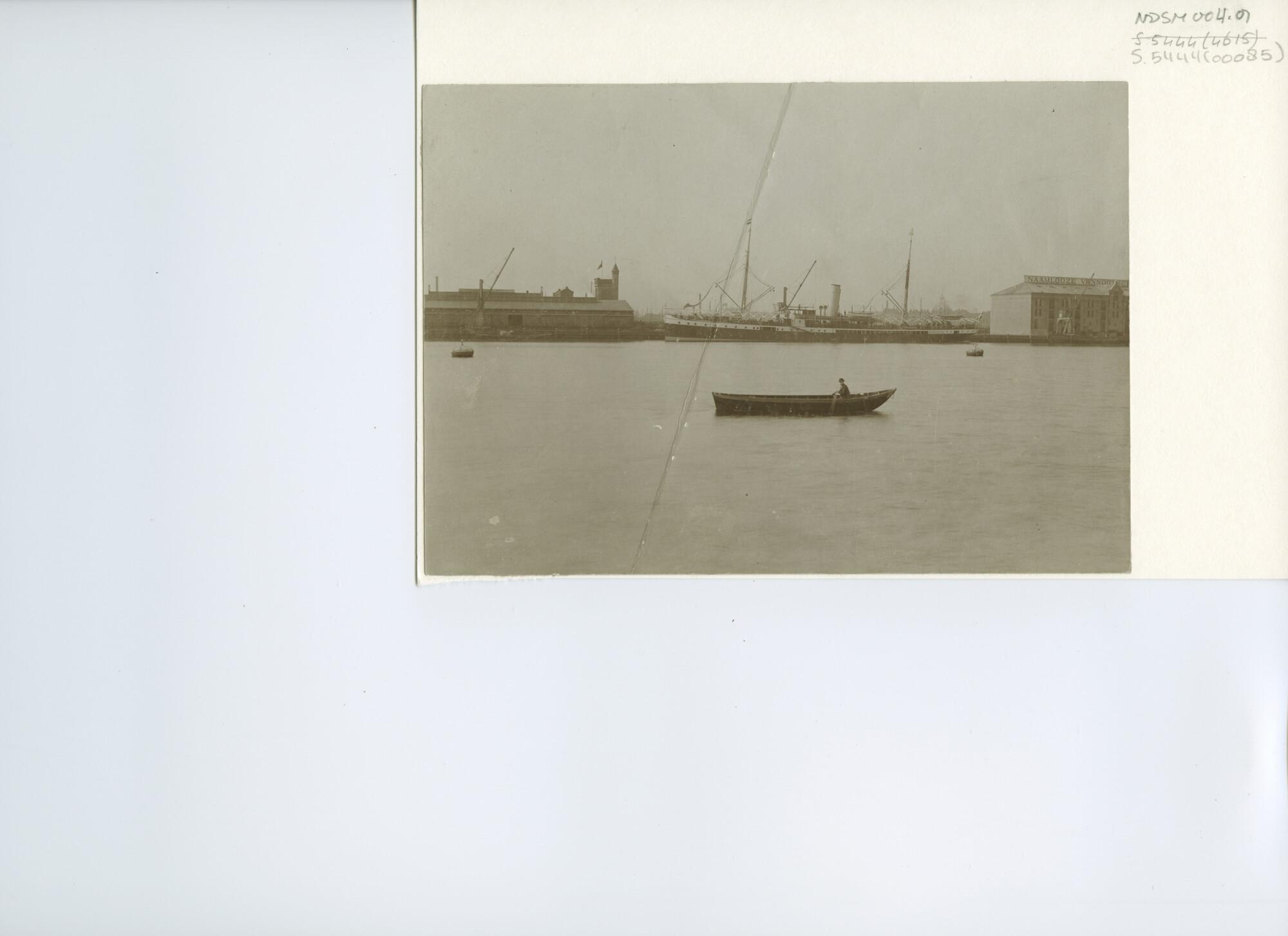 Het vracht- en passagiersschip ss. "Van Outshoorn" van de Koninklijke Paketvaart-Maatschappij ligt afgemeerd aan de kade in Amsterdam.