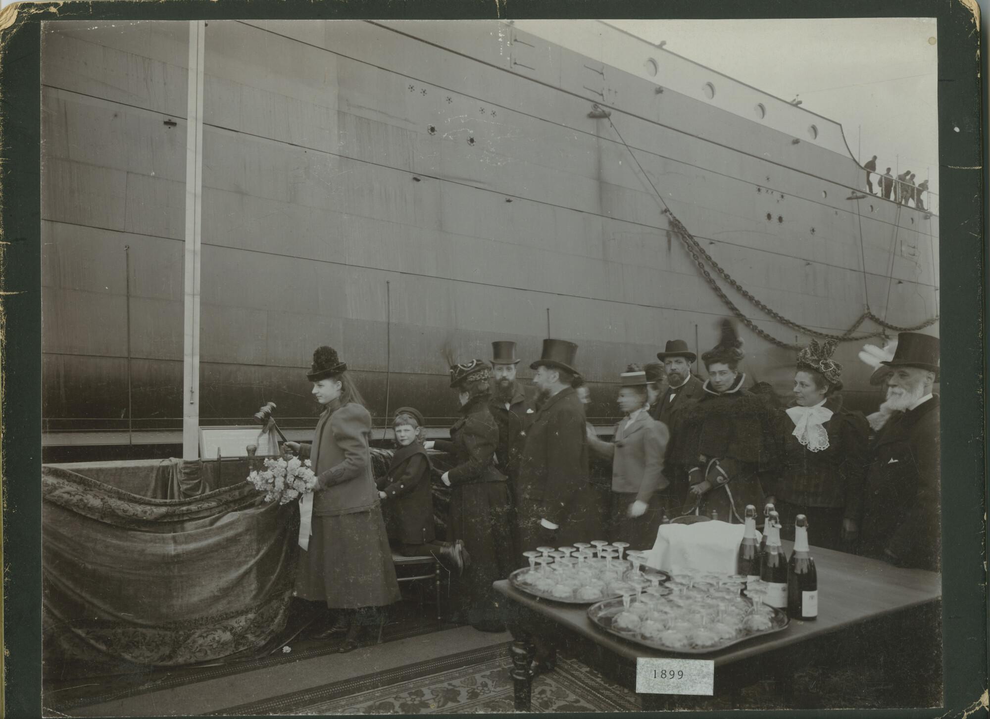 Foto van de tewaterlating van het vrachtschip ss. Soembawa gebouwd door de Nederlandsche Scheepsbouw Maatschappij in opdracht van de Stoomvaart-Maatschappij Nederland (SMN) te Amsterdam, 1898.