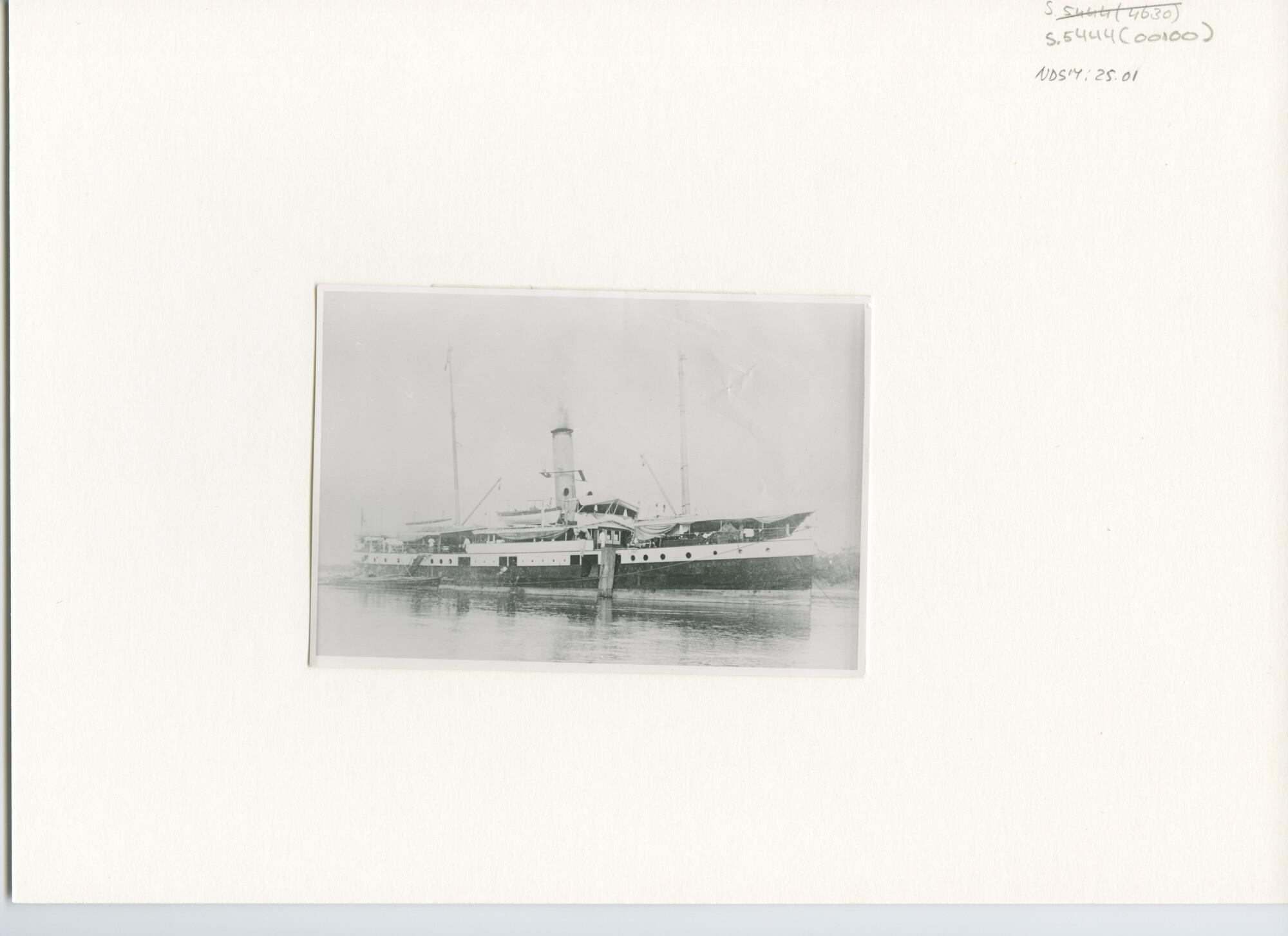 Het vrachtschip ss. "Van der Parra" van de Koninklijke Paketvaart-Maatschappij voor anker ergens in Nederlands Indië. [Reproductiefoto]
