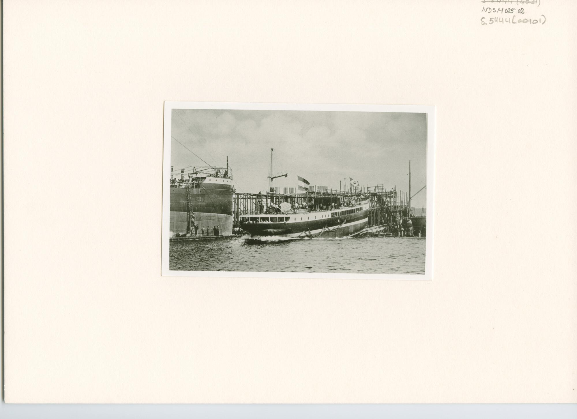 De tewaterlating van het vrachtschip ss. "Van der Parra" van de Koninklijke Paketvaart-Maatschappij bij de Nederlandsche Scheepsbouw Maatschappij te Amsterdam. [Reproductiefoto]