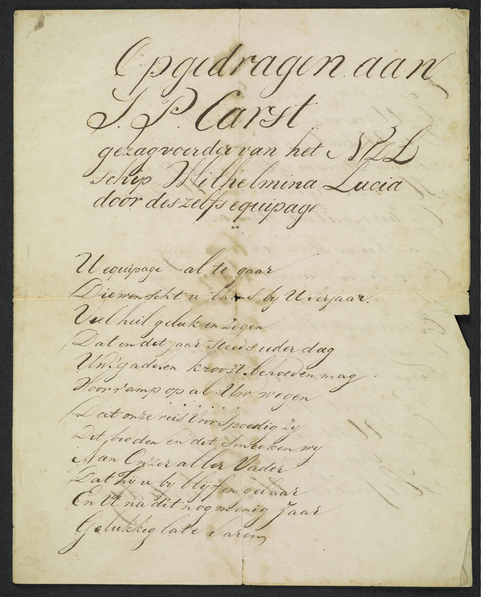 Gedicht, opgedragen aan J.P. Carst, gezagvoerder van de Wilhelmina Lucia