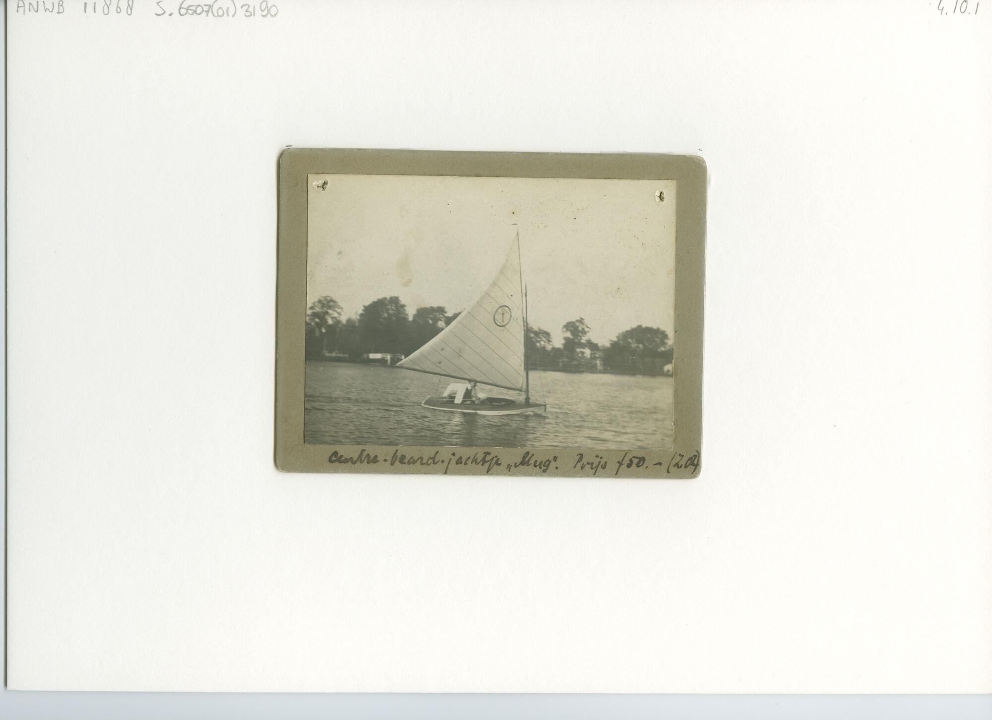 Zijaanzicht over stuurboord van het centre-board [midzwaard] zeiljachtje Mug. Éénpersoons gaffel getuigd zeiljachtje met een rond zeilteken met daarin het cijfer 1. De prijs van het scheepje bedraagt volgens opschrift Fl. 50,-- Op de achtergrond een bomenrij [Amstel]. In het scheepje de ontwerper van het jachtje.
