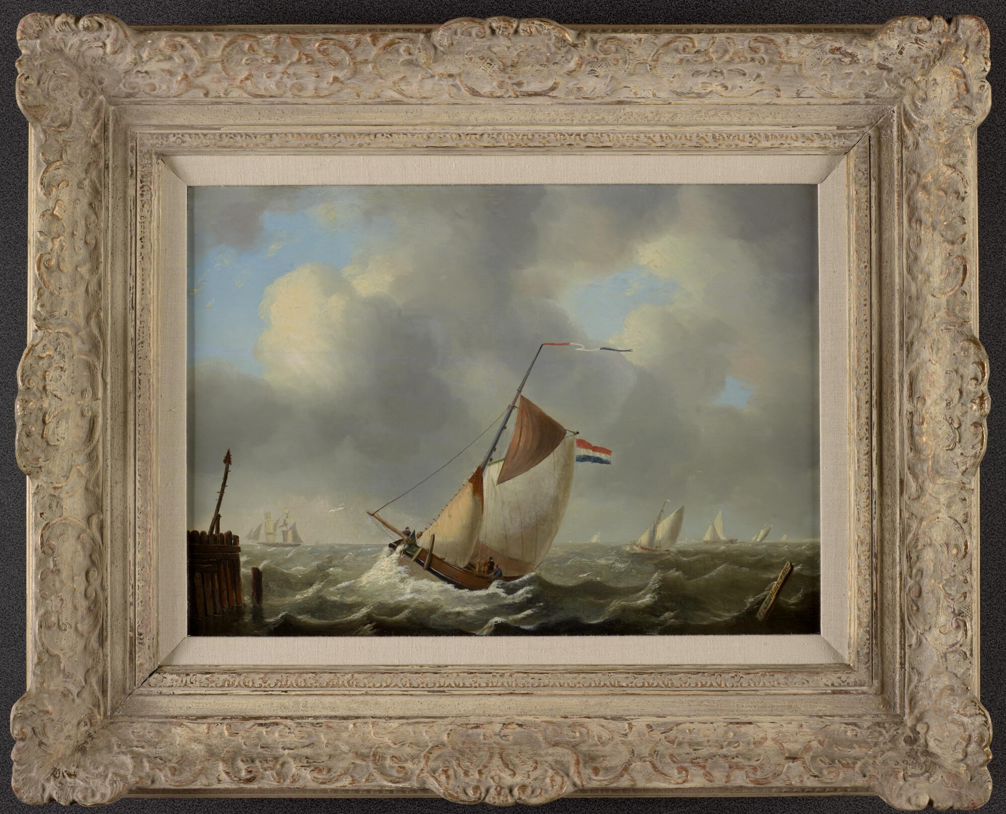 Een beurtvaarder varend op woelig water nadert een havenhoofd of pier. Op de achtergrond zijn meerdere schepen onder zeil. In geornamenteerde witte lijst.