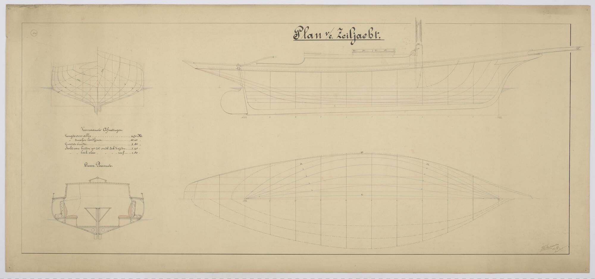 Lijnenplan met spantenraam en dwarsdoorsnede over het grootspant van een zeiljacht met kajuit. Overhangende achtersteven, aangehangen roer, lange kiel, klippersteven met boegspriet. Kajuitdak met bovenlichten. Afmetingen: lengte o.a. 14.70 m, lengte tussen de loodlijnen 10.40 m, breedte 3.80 m (schaal 1:20).
