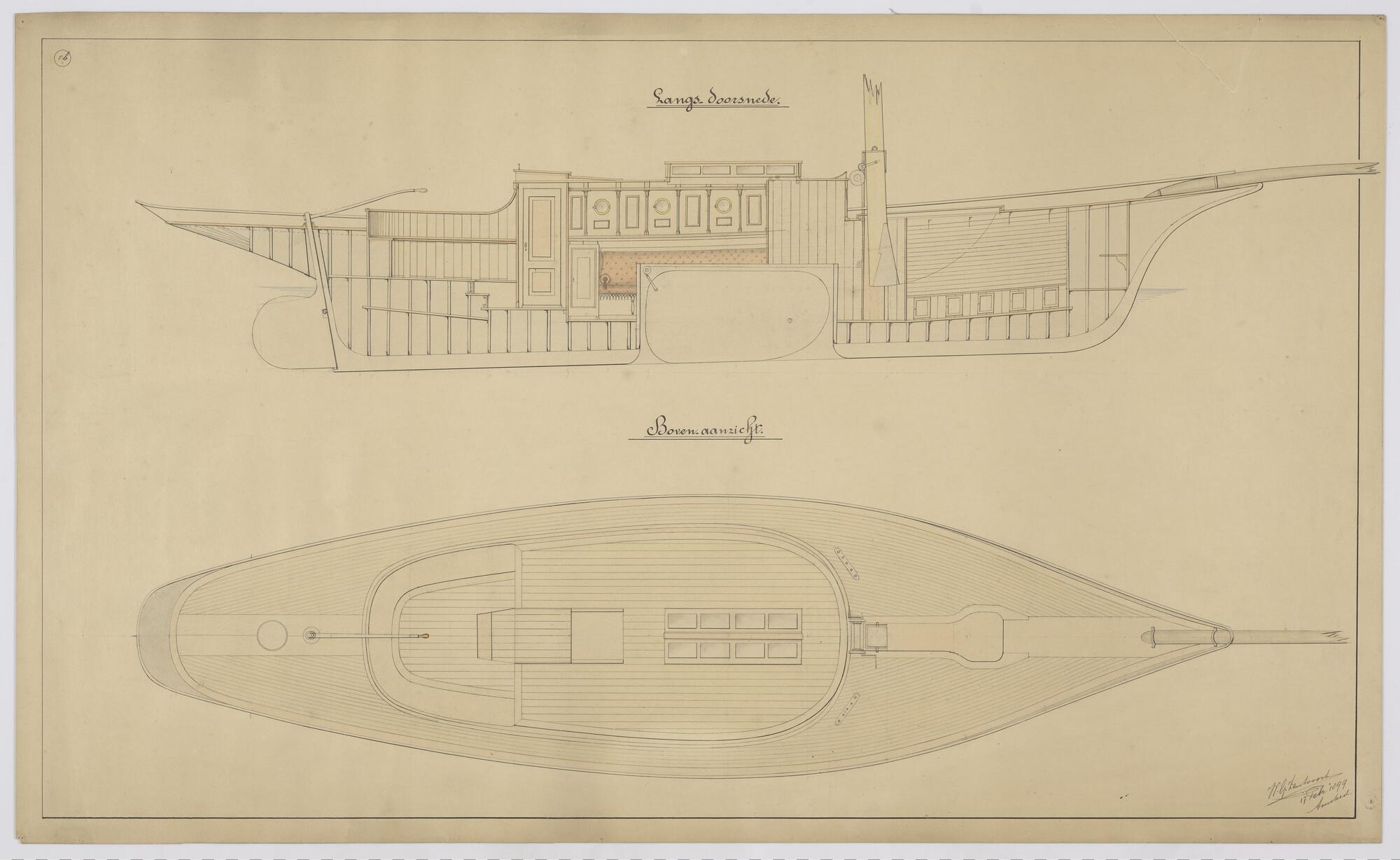 Verticale langsdoorsnede en bovenaanzicht van een midzwaard zeiljacht met kajuit. Met hout belegd dek en kajuitopbouw. Kajuitdak met acht bovenlichten. Kajuitopbouw met drie patrijspoorten. Houten mast en boegspriet. Overhangende achtersteven, klippersteven. Stuurkuip met helmstok. Afmetingen: lengte o.a. 14.70 m, lengte tussen de loodlijnen 10.40 m, breedte 3.80 m (schaal 1:20).
