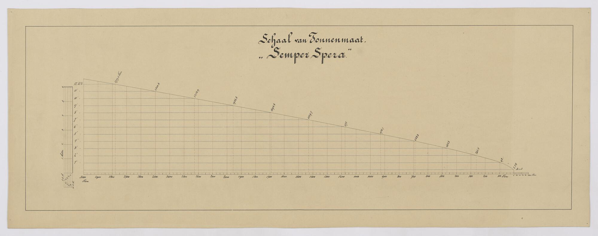 Schaal van tonnenmaat van het van het stalen barkschip Semper Spera (Houd altijd Hoop). 2777.5 ton waterverplaatsing = 3.35 m (12ft) H.D. Afmetingen: lengte tussen de stevens 61.20 m, lengte tussen de loodlijnen 59.62, breedte 11 m, diepgang met inventaris, provisie, water etc. 2.45 m.