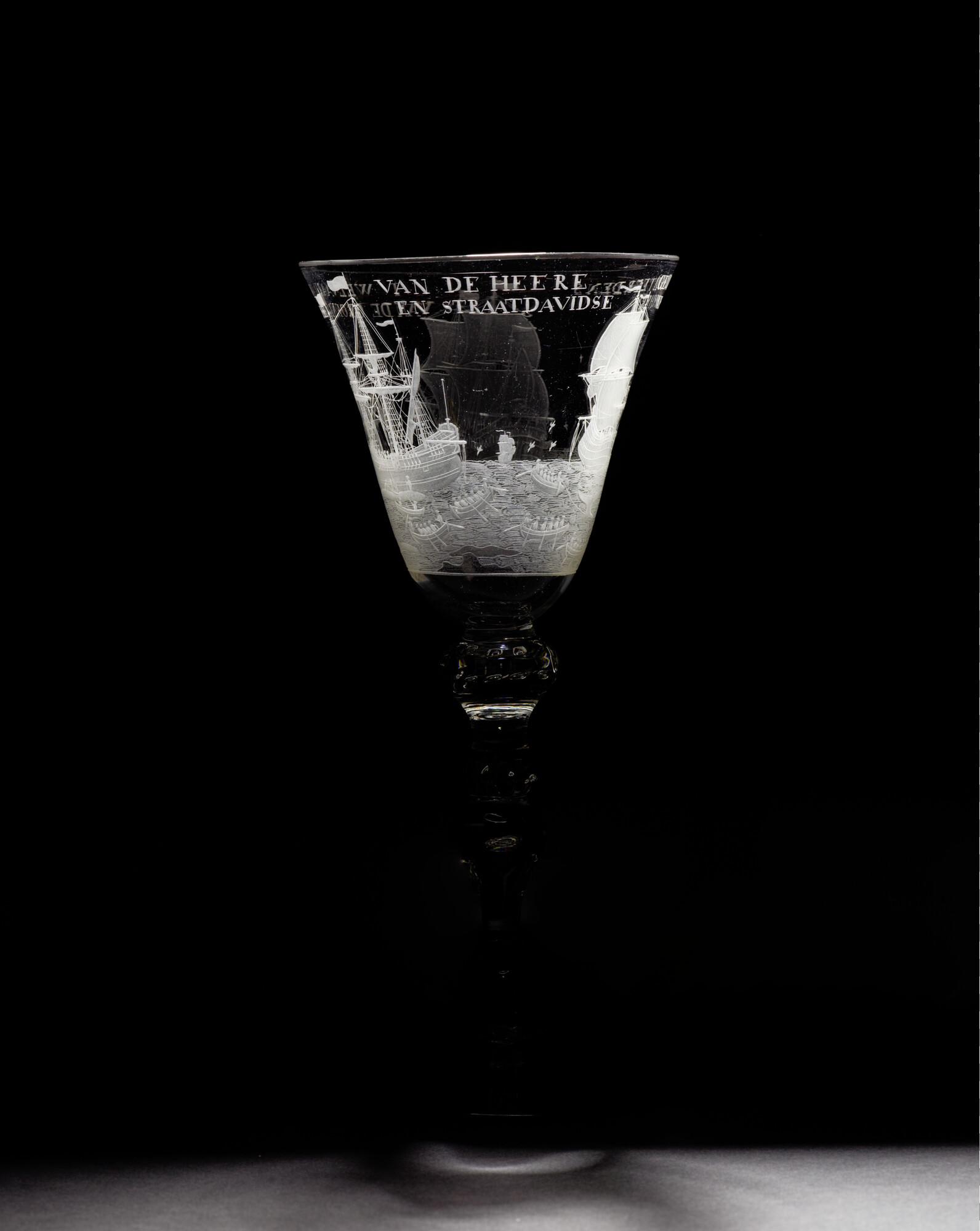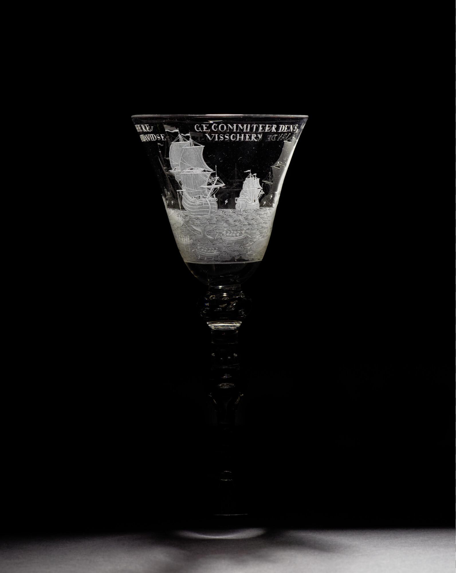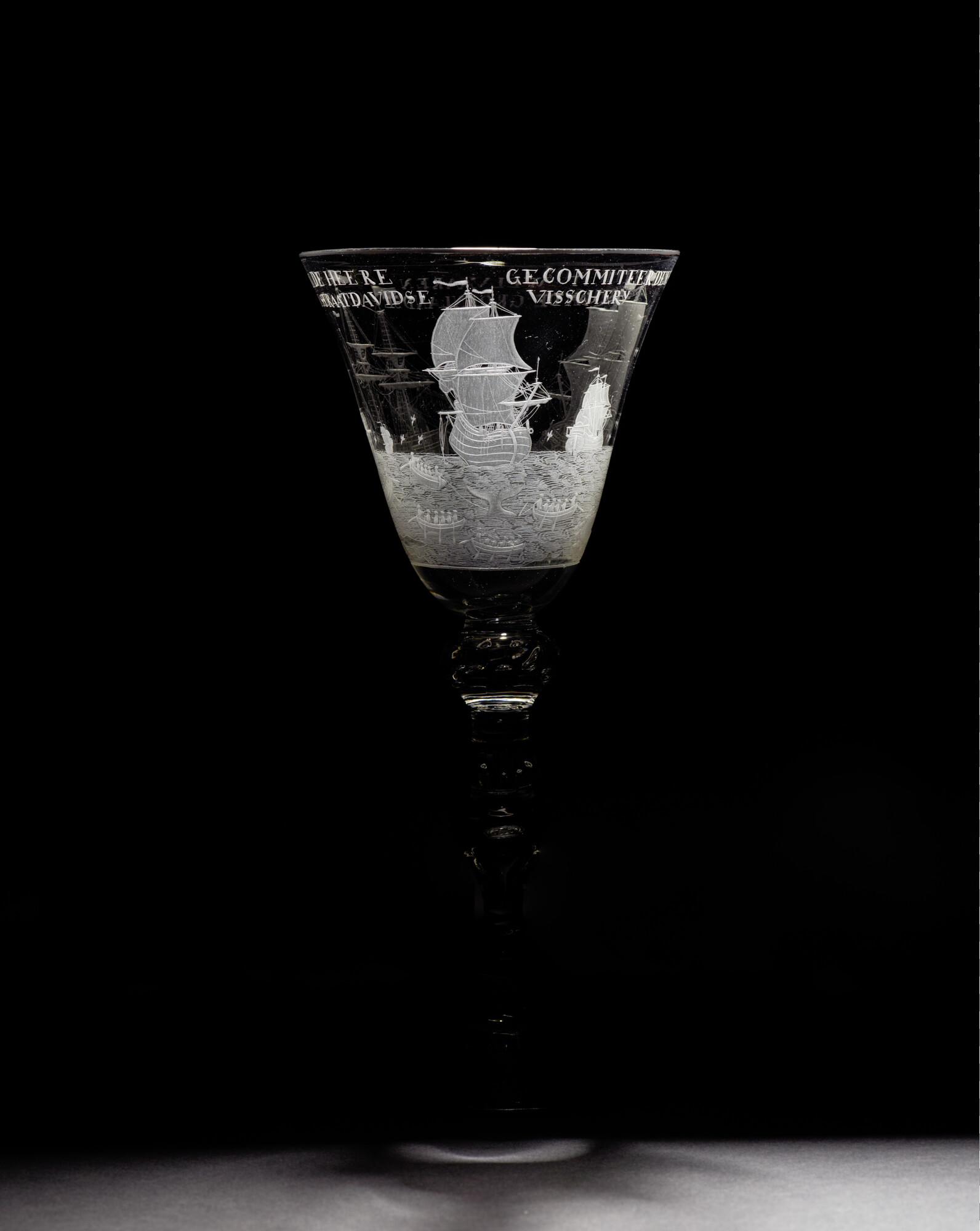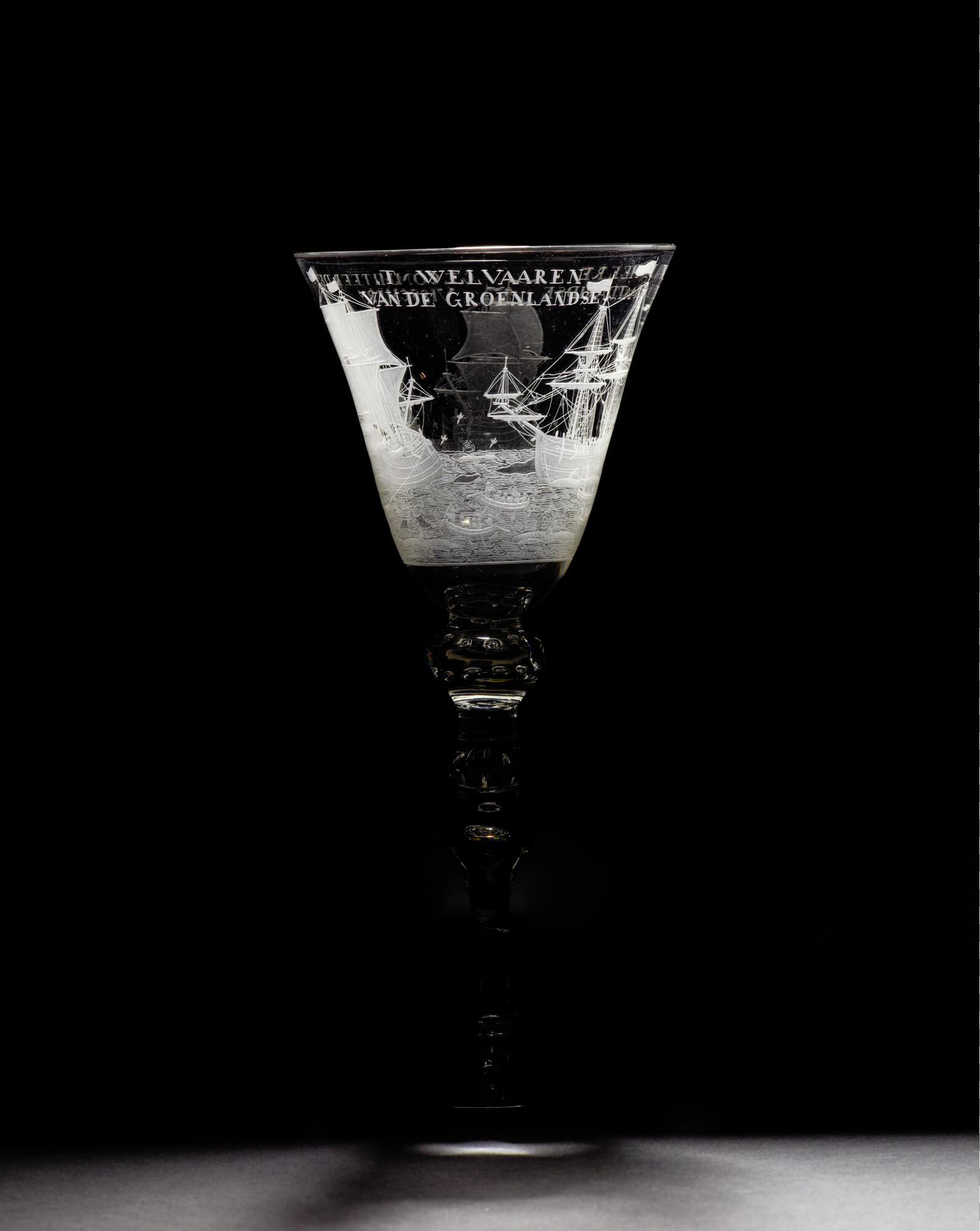 Gelegenheidsglas met een aan de bovenzijde iets uitlopende trechtervormige kelk met gegraveerde voorstelling van de walvisvaart, op een smalle stam.