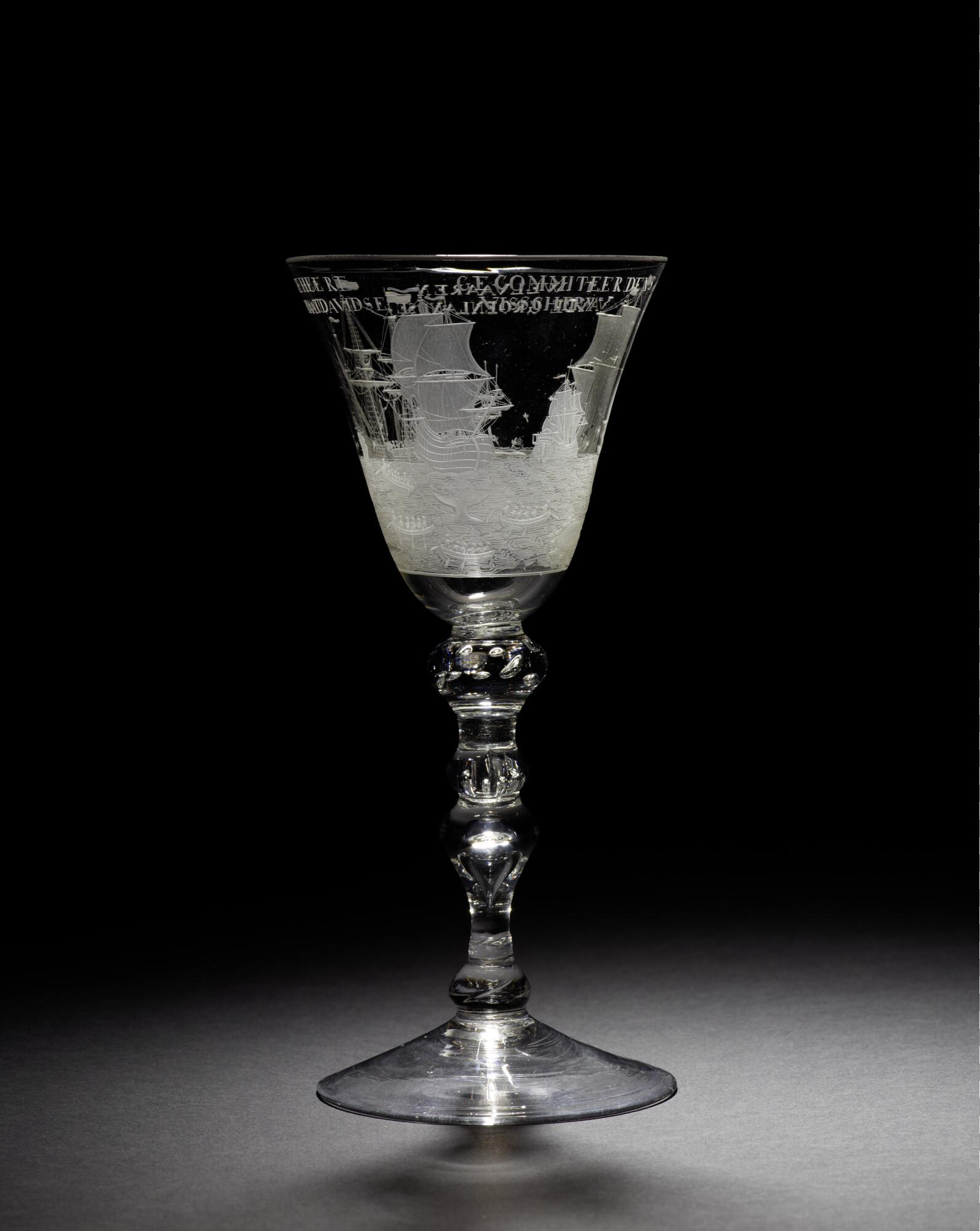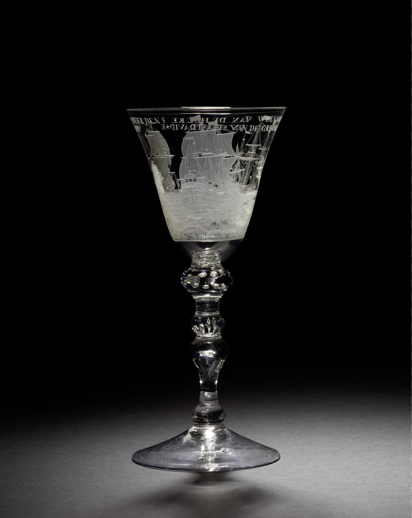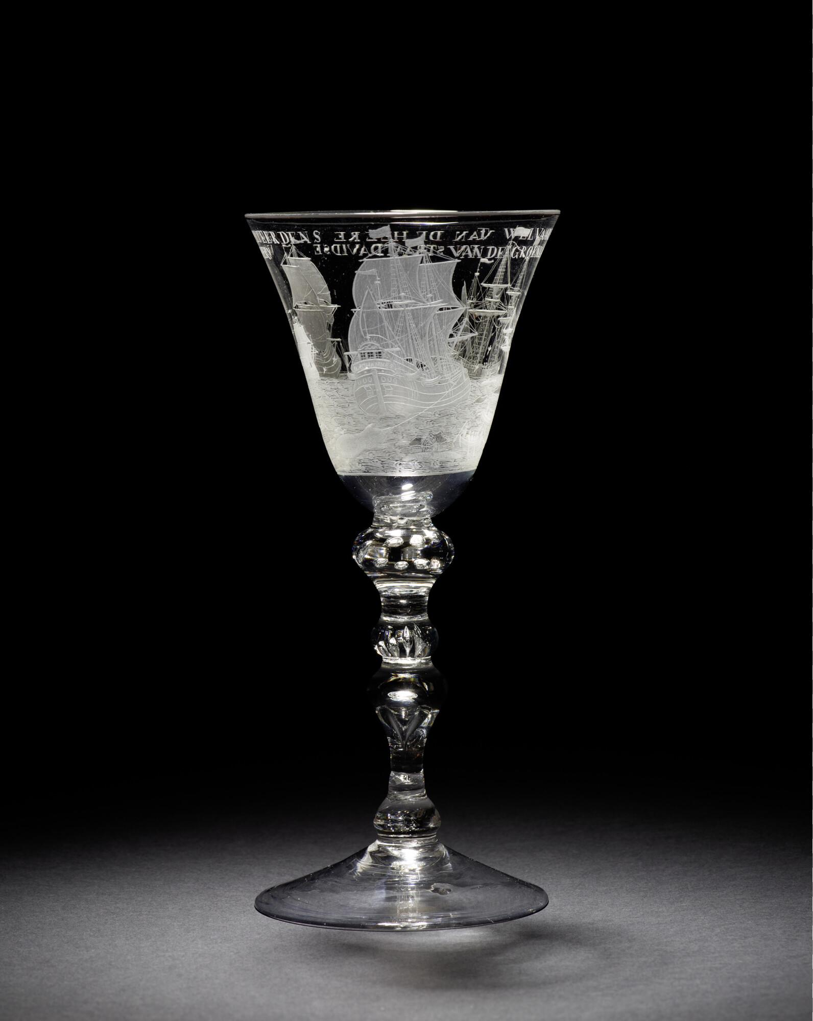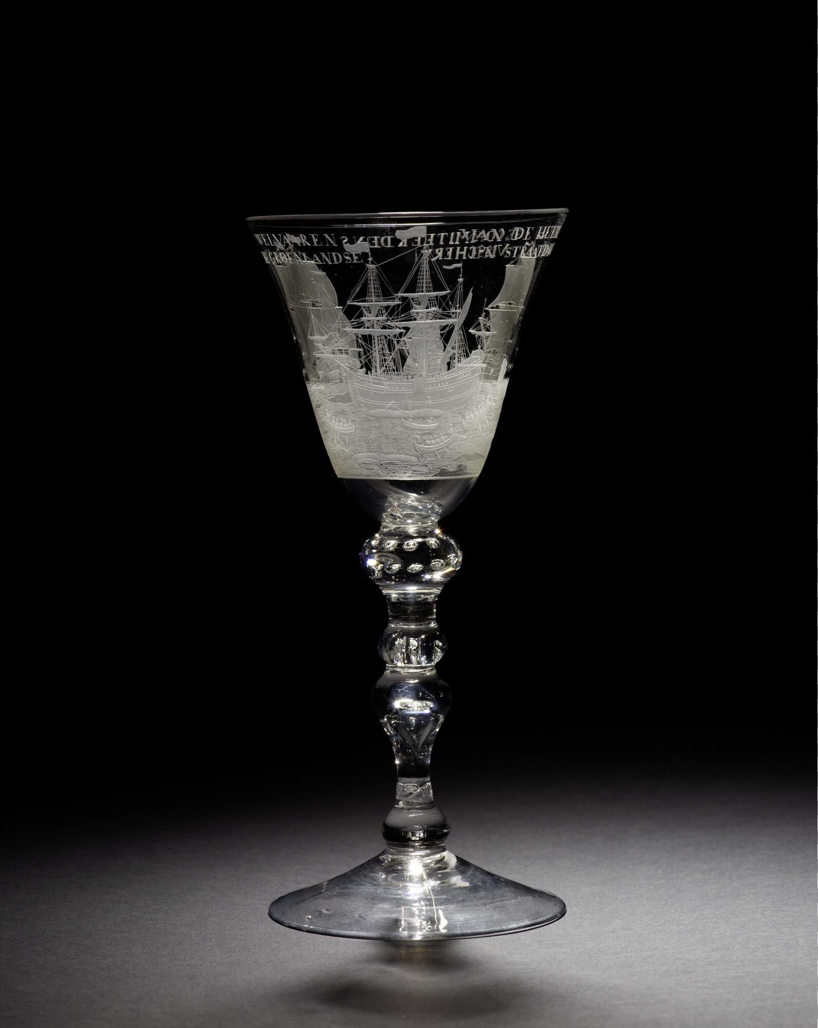 Gelegenheidsglas met een aan de bovenzijde iets uitlopende trechtervormige kelk met gegraveerde voorstelling van de walvisvaart, op een smalle stam.
