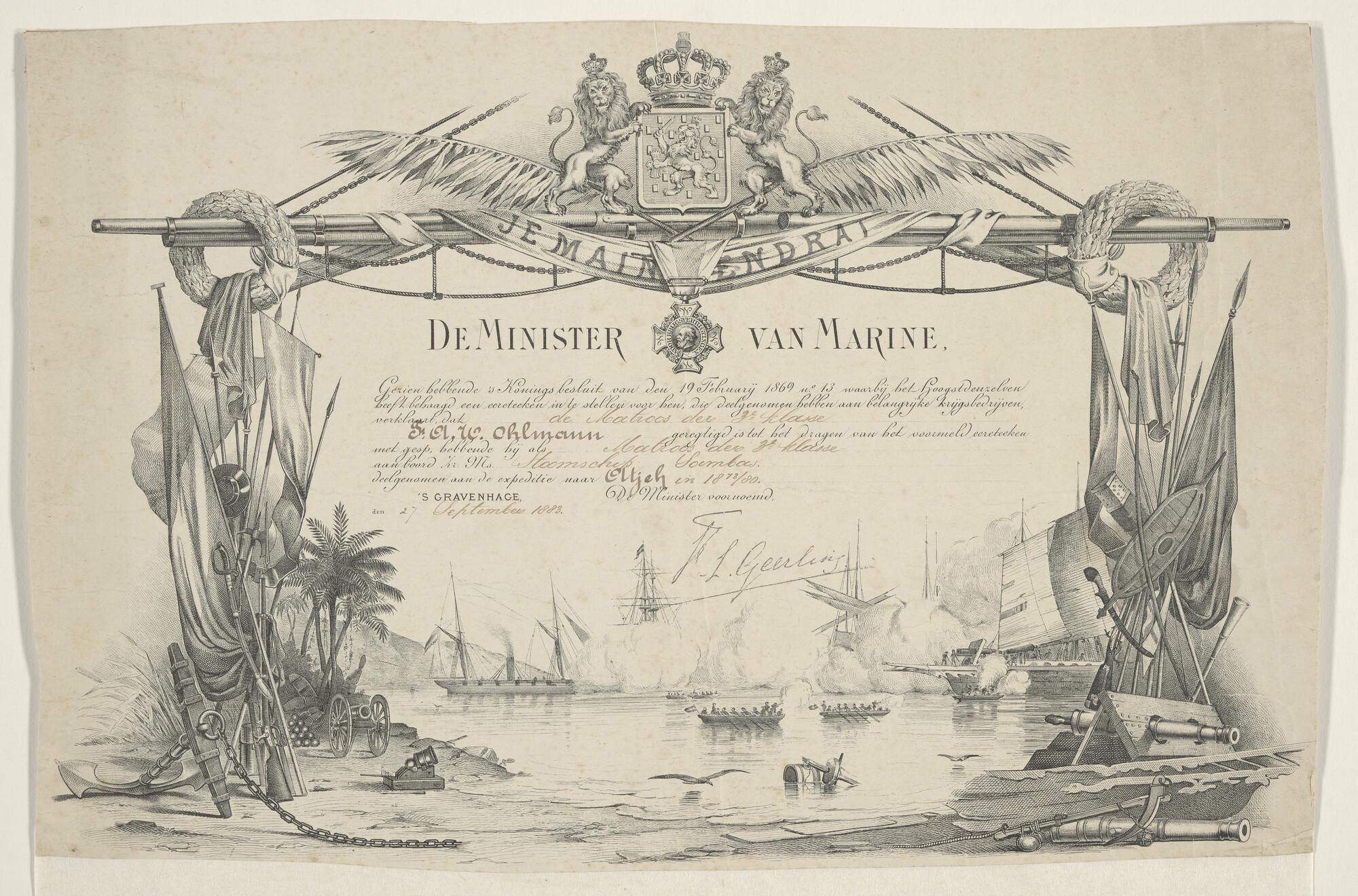 Certificaat behorend bij het Ereteken voor Belangrijke Krijgsbedrijven (ofwel Expeditiekruis) voor F.A.W. Ohlmann, die als Matroos der 3e Klasse a/b Zr.Ms. Sambas heeft deelgenomen aan de expeditie naar Atjeh in 1873/1880.