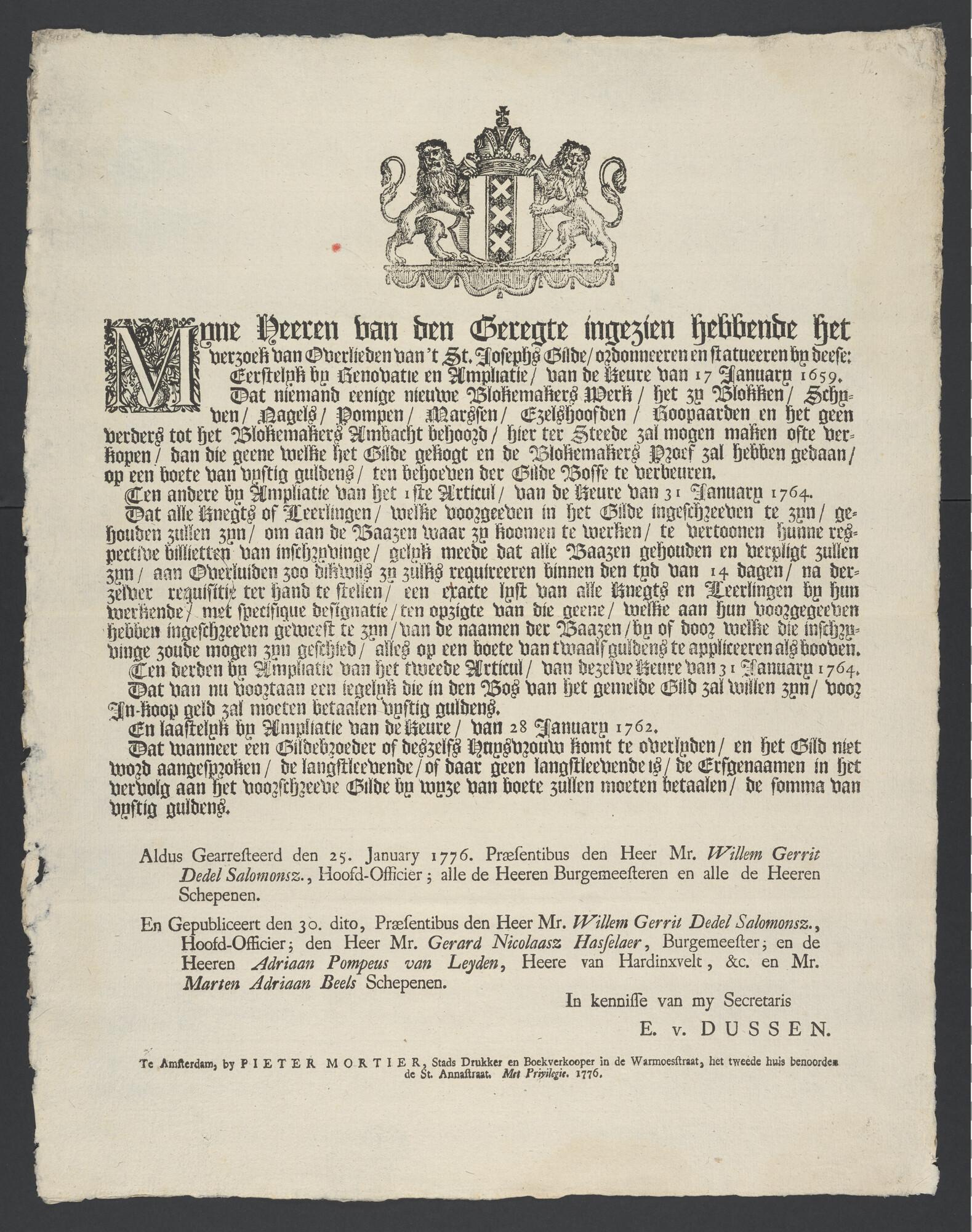 Ordonnantie inzake het Blokemakers Gilde te Amsterdam, gepubliceerd op 30 januari 1776.