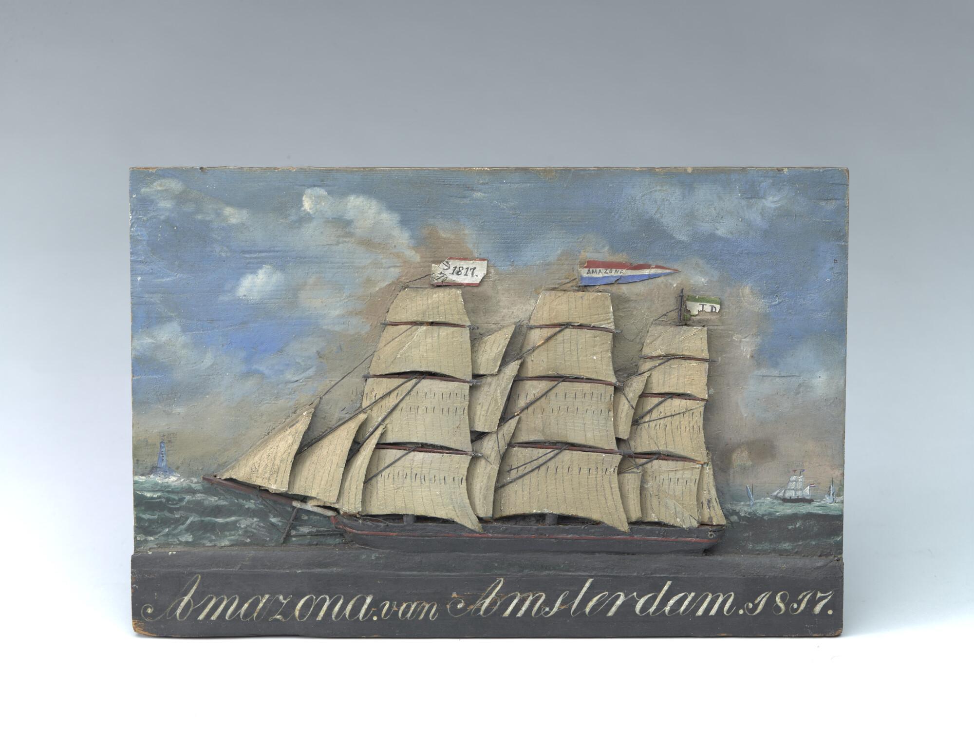 Paneel met gesneden voorstelling van een driemaster met opschrift "Amazona van Amsterdam 1817".